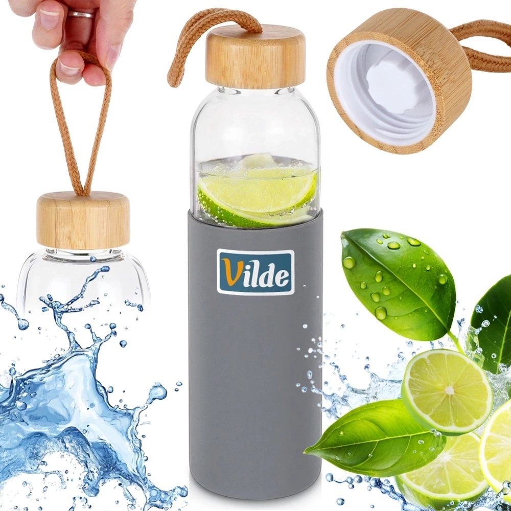 Butelka z bambusową zakrętką. Szczelna dzięki uszczelce. Wykonana z wytrzymałego szkła, więc nadaje się zarówno do napojów ciepłych jak i zimnych. Wygodna w trzymaniu, dzięki silikonowej powłoce oraz zawieszce umieszczonej w nakrętce. Klasyczny design sprawia, że butelka ma wyjątkowy styl. Odpowiednie nawilżenie w ciągu dnia jest bardzo ważne, dlatego warto butelkę mieć zawsze przy sobie. Butelka jest poręczna i wygodna w użytkowaniu. Oryginalny produkt marki Vilde. Wyprodukowano zgodnie z europejskimi standardami.