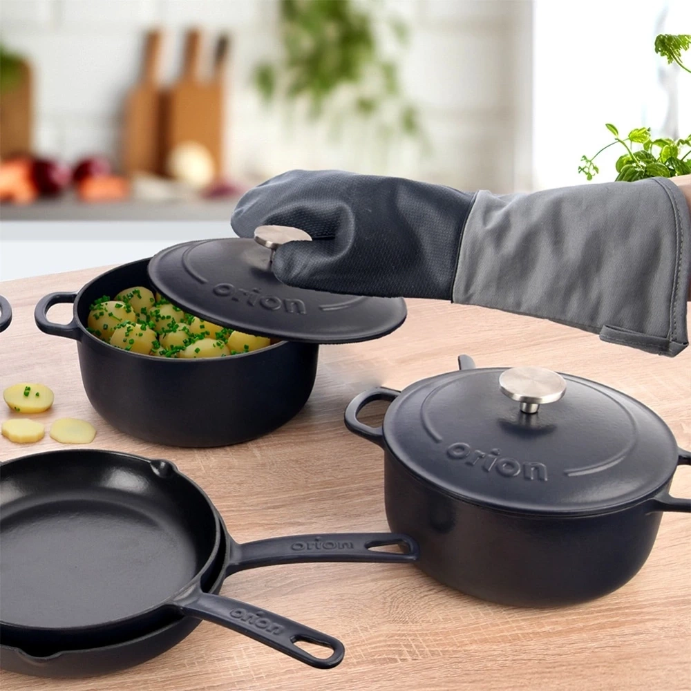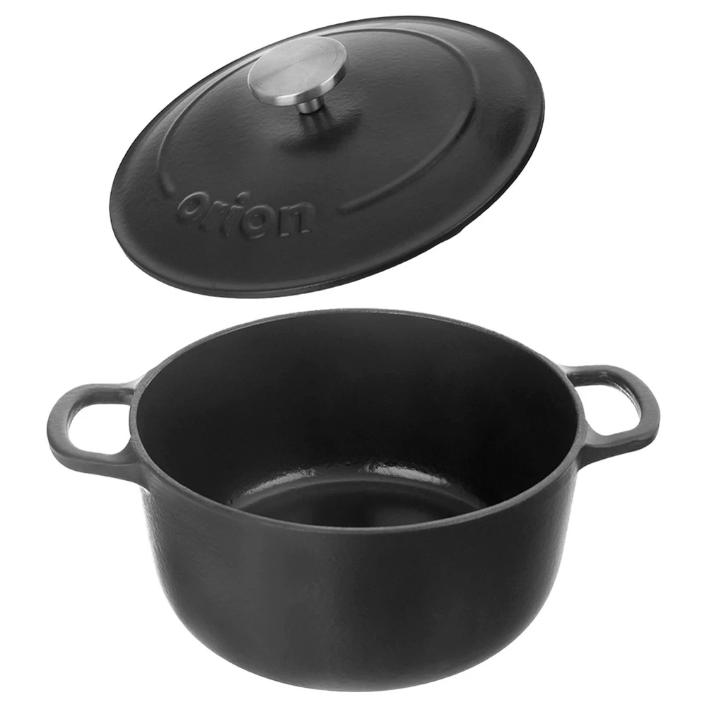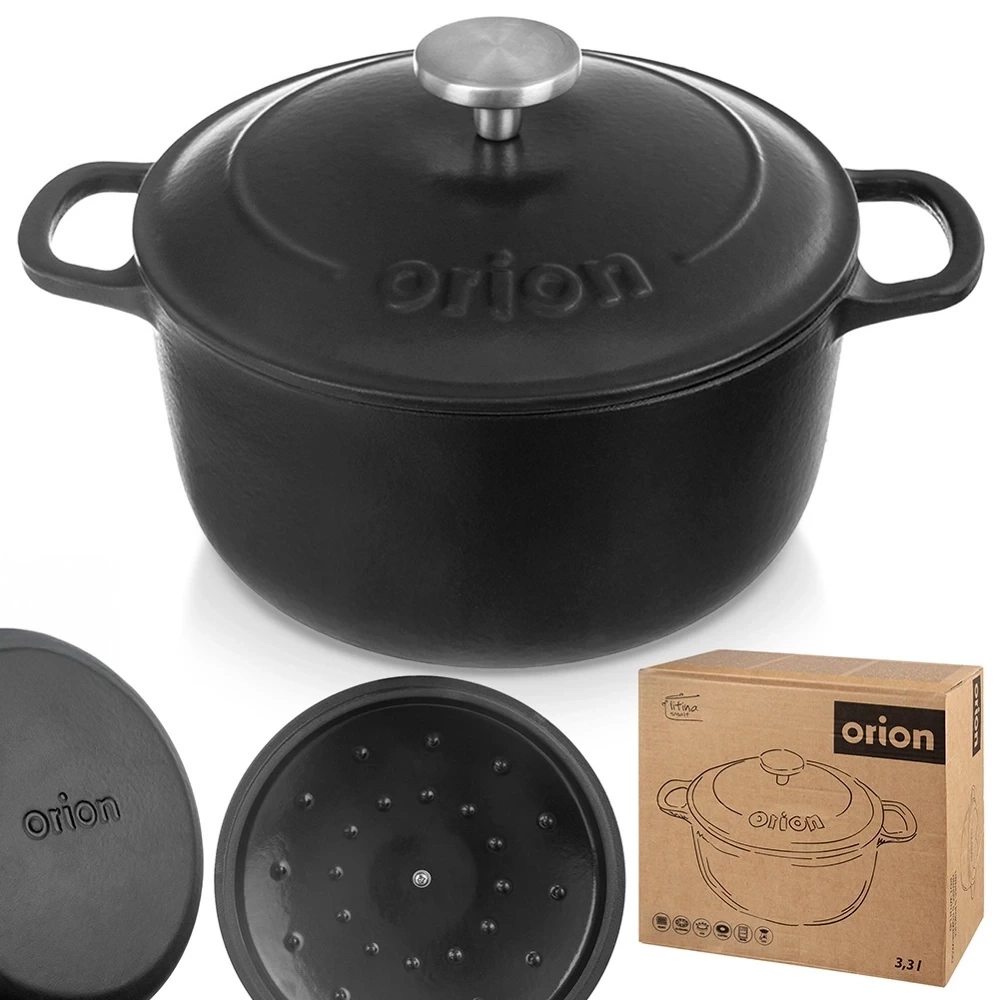 Garnek żeliwny z pokrywką przydatny w każdym domu. Idealny do gotowania, pieczenia, duszenia oraz smażenia potraw. Potrawy przygotowane w garnku będą soczyste i aromatyczne. Możemy użytkować ją w każdej kuchence, ale również bezpośrednio na grillu, czy ogniu. Żeliwo rozgrzewa się równomiernie i długo utrzymuje ciepło, dzięki czemu serwowane dania dłużej będą ciepłe. Oryginalny produkt czeskiej marki Orion. Wyprodukowano zgodnie z europejskimi standardami.
