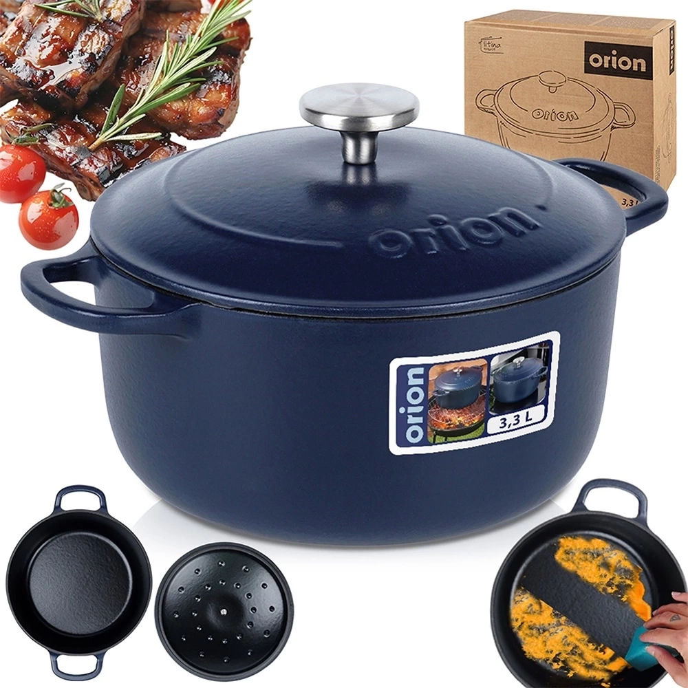 - Żeliwny garnek z pokrywką o pojemności 3,3 l z emaliowaną powłoką. Nadaje się na każdą kuchenkę w tym indukcję oraz do piekarnika czy na grilla. Uniwersalne zastosowanie.