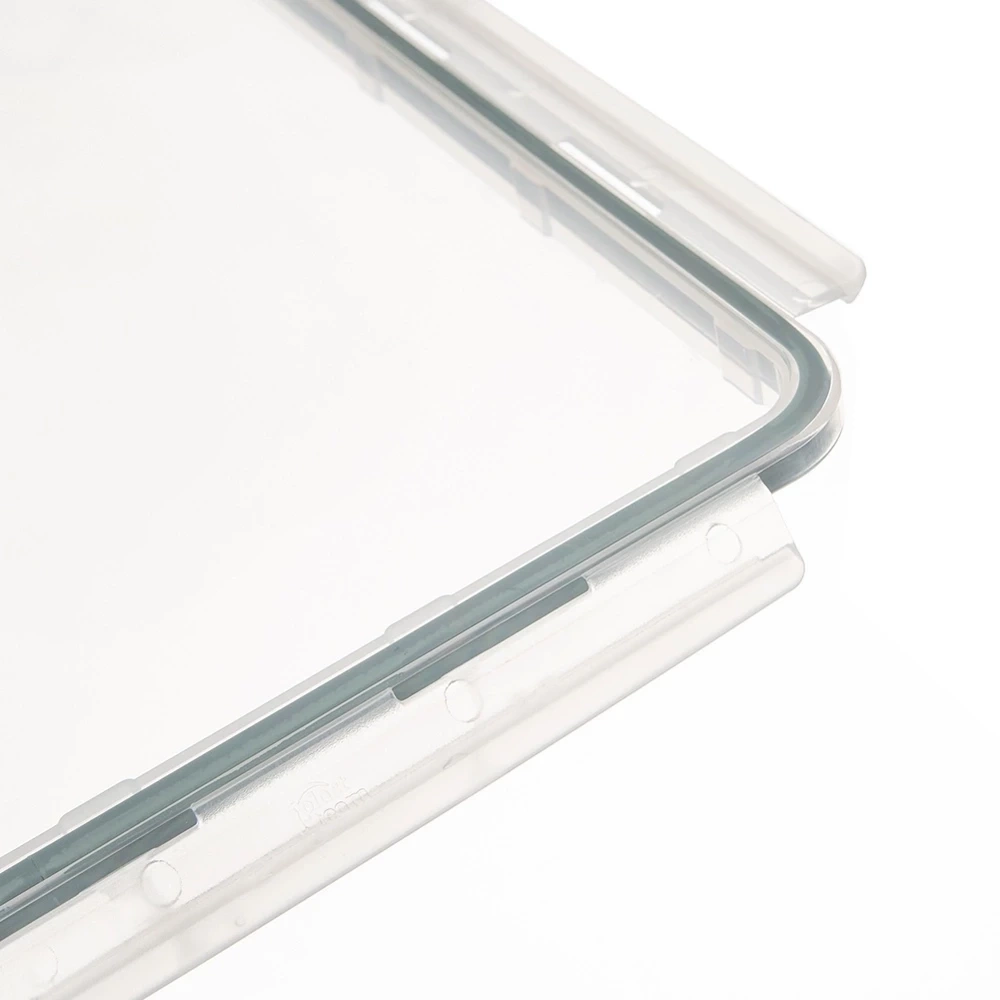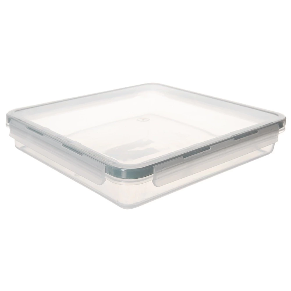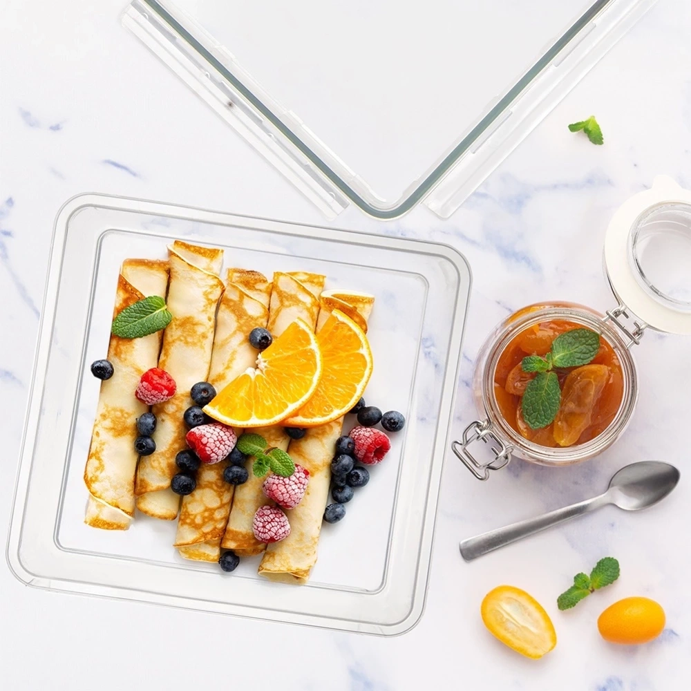- Przezroczysty pojemnik z silikonową uszczelką w pokrywie. Szczelna pokrywa zamykana na klipsy. Nadaje się do lodówki, mikrofalówki i zmywarki.
