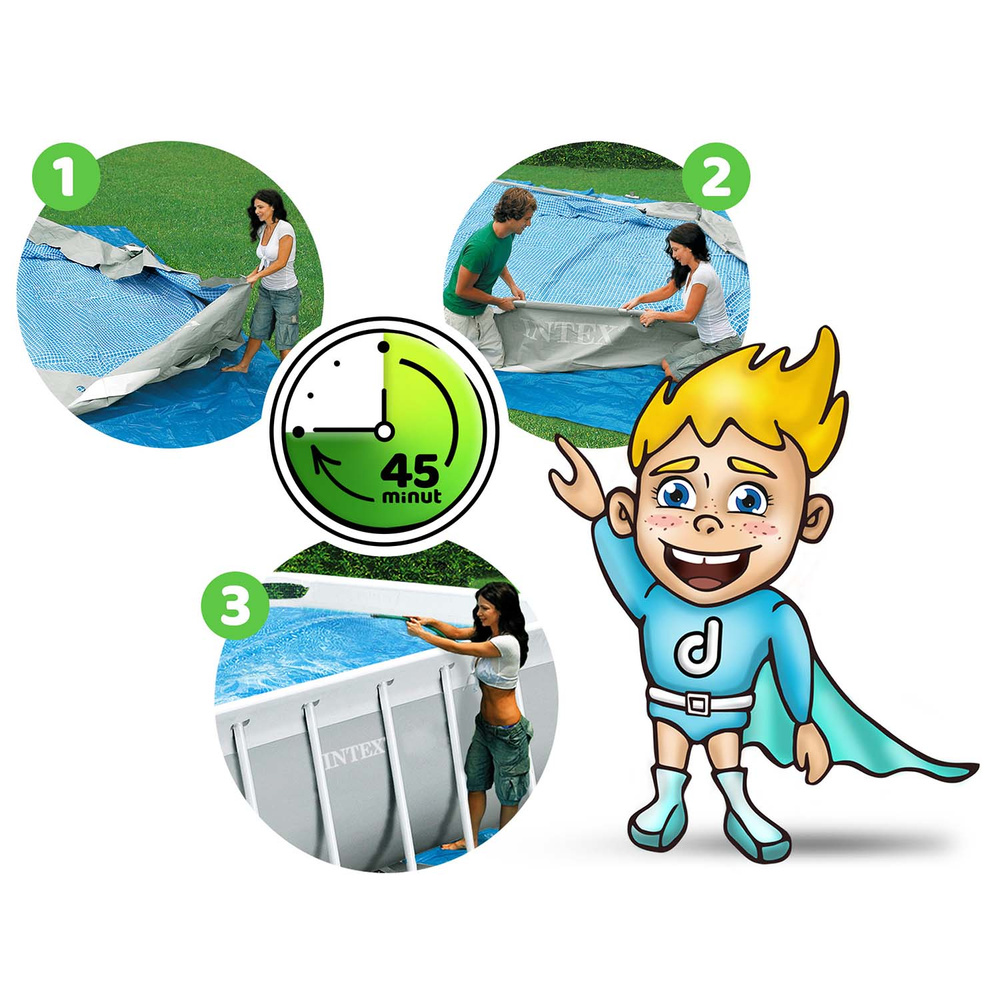 Basen na metalowym stelażu z serii PRISM FRAME RECTANGULAR o wymiarach 400 x 200 x 100 cm jest doskonałą propozycją na upalne lato. Wykonany z bardzo trwałego trójwarstwowego materiału PCV, będzie służył całej rodzinie przez wiele sezonów. Wewnętrzne ściany basenu pokryte zostały grafiką na wzór mozaiki kafelkowej, co dodatkowo uatrakcyjnia beztroską zabawę. Niepodważalnym atutem prezentowanego zestawu jest łatwy montaż niewymagający dodatkowych narzędzi. Wszystkie belki oraz trójniki łączą się ze sobą za pomocą sprężynowych zatyczek bądź bolców. Elementy konstrukcji stelaża wykonane są z najwyższej jakości stali, odpornej na korozję. Zapewnia to trwałość oraz bezpieczeństwo użytkowania.