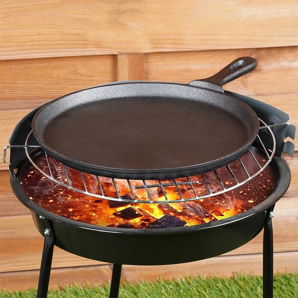 - Uniwersalne zastosowanie - Patelnia żeliwna do naleśników sprawdzi się nie tylko do smażenia cienkich naleśników, ale także do przygotowywania omletów, placków, pizzy, tortilli, jajek sadzonych, czy smażenia mięsa. Dzięki solidnej konstrukcji i równomiernemu rozprowadzaniu ciepła doskonale nadaje się do różnych potraw, gwarantując ich idealne przyrumienienie. Sprawdzi się do przyrządzenia pysznego i aromatycznego jedzenia w każdej kuchni, na kempingu czy podczas grillowania.