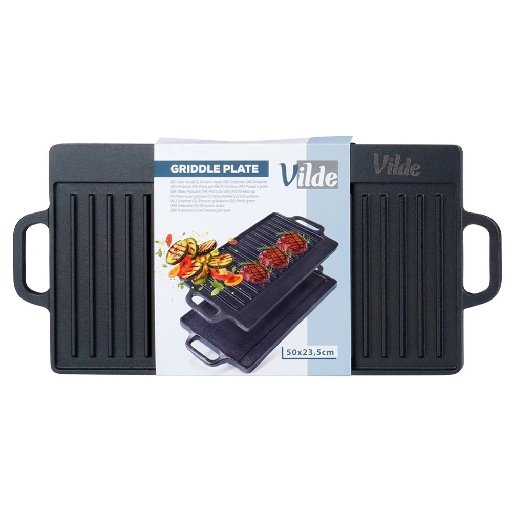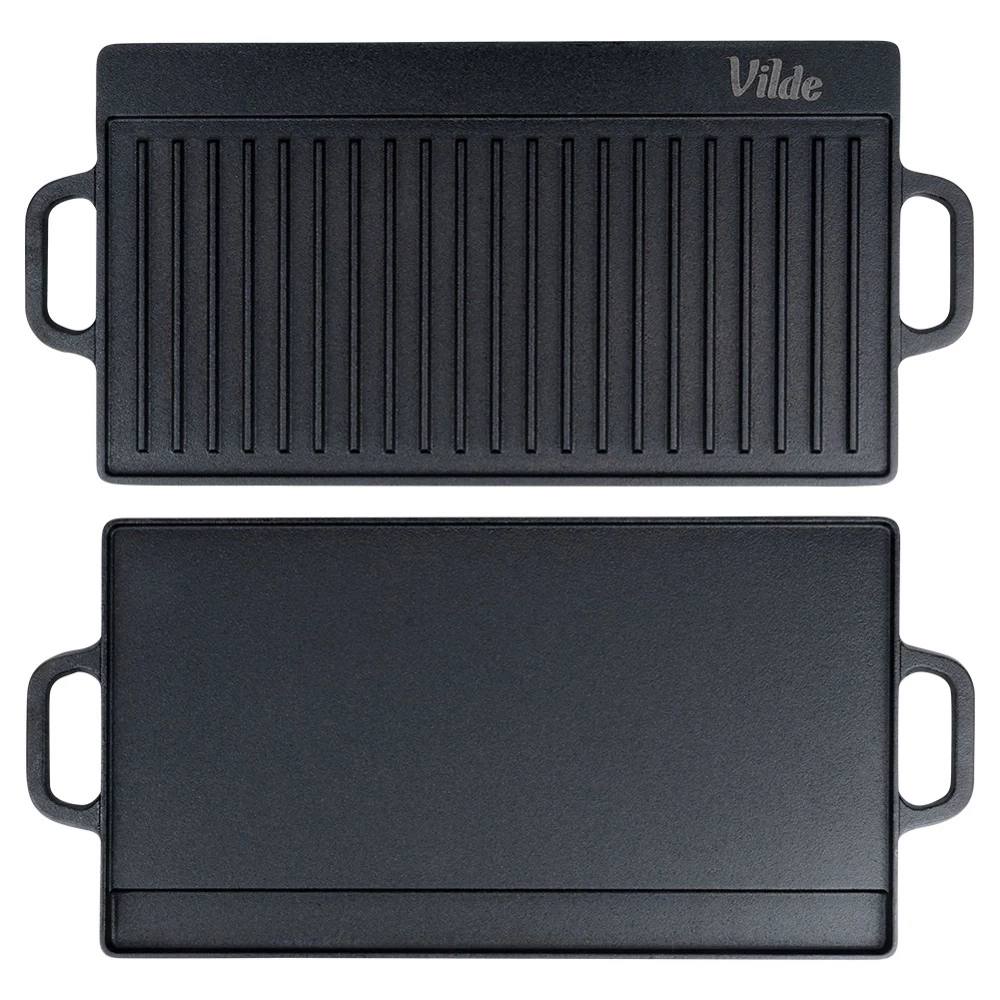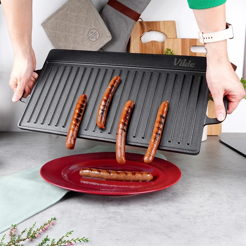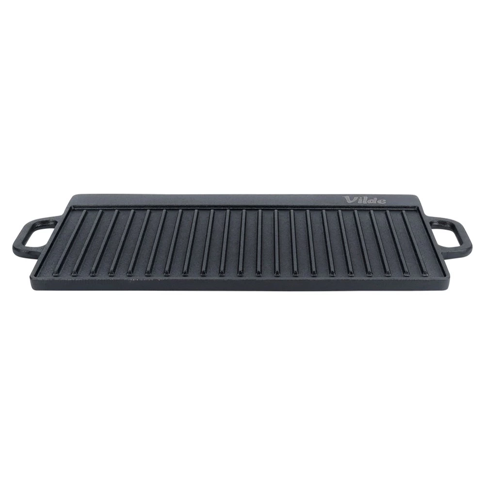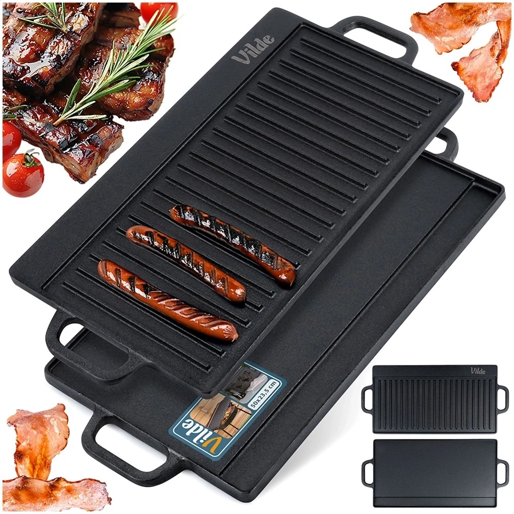 Dwustronna płyta żeliwna do grillowania mięs, ryb, warzyw. Posiada dwie powierzchnie grillowe przydatne do różnego rodzaju potraw. Płyta jest wytrzymała i odporna. Żeliwo z którego została wykonana jest wysokiej jakości gwarantuje długotrwałą wydajność i odporność na codzienne użytkowanie. Oryginalny produkt marki Vilde. Wyprodukowano zgodnie z europejskimi standardami.