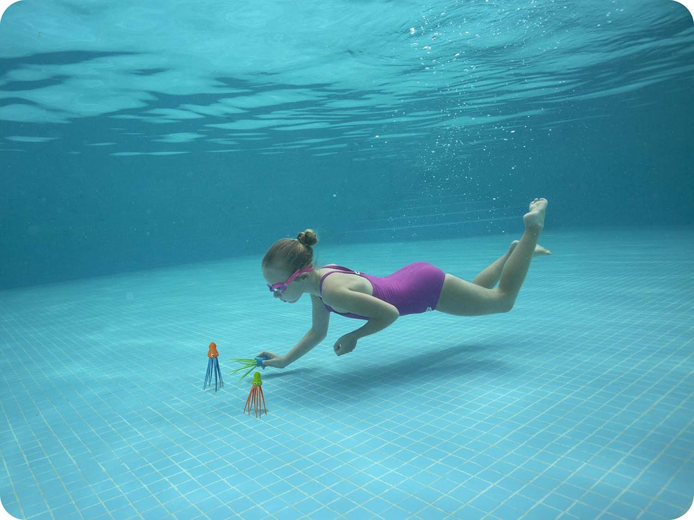 - Kolorowy design: Zestaw zawiera trzy pałeczki w kształcie ośmiorniczek w różnych kolorach: pomarańczowym, zielonym i niebieskim, co ułatwia ich odnalezienie pod wodą i czyni zabawę bardziej interesującą.