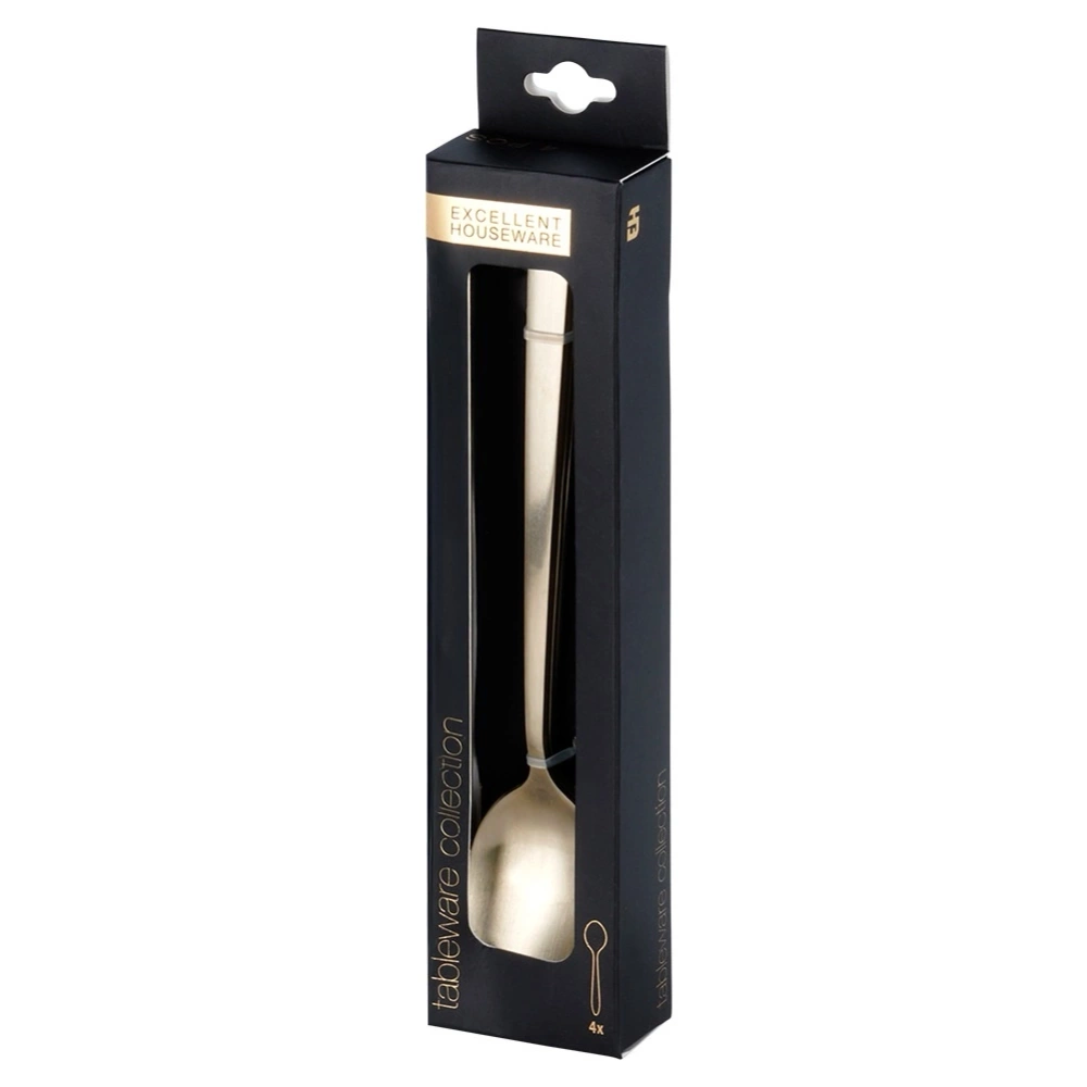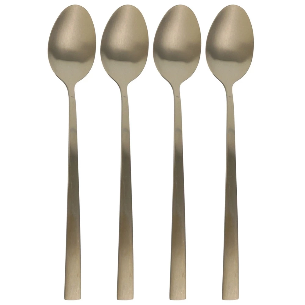 - Zestaw czterech łyżeczek koktajlowych wykonanych ze stali nierdzewnej w złotym, satynowym kolorze. Doskonale sprawdzą się do serwowania ulubionego deseru, kawy latte.