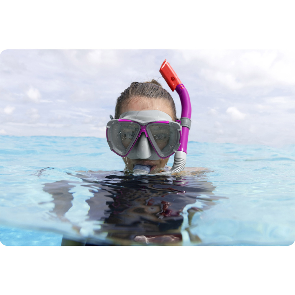 - Fioletowy zestaw do nurkowania Bestway, składający się z maski i fajki, zapewnia doskonałą widoczność oraz komfort podczas podwodnych przygód. Idealny dla entuzjastów snorkelingu i pływania.
