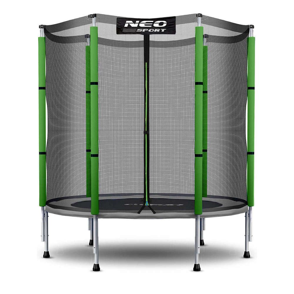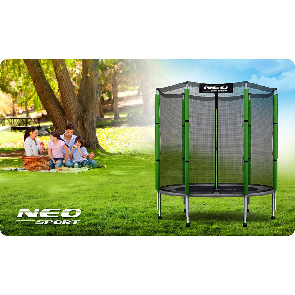 Trampolina Neo-Sport to bezpieczny i stabilny sprzęt sportowy o średnicy 140 cm. Siatka zabezpieczająca wyposażona jest w trwały suwak błyskawiczny. Słupki stelażu obito grubą gąbką, natomiast sprężyny mocujące matę osłonięto specjalnym kołnierzem ochronnym, który posiada wewnątrz piankę. Takie rozwiązania gwarantują bezpieczne korzystanie z trampoliny i ochronę przed urazami mechanicznymi.