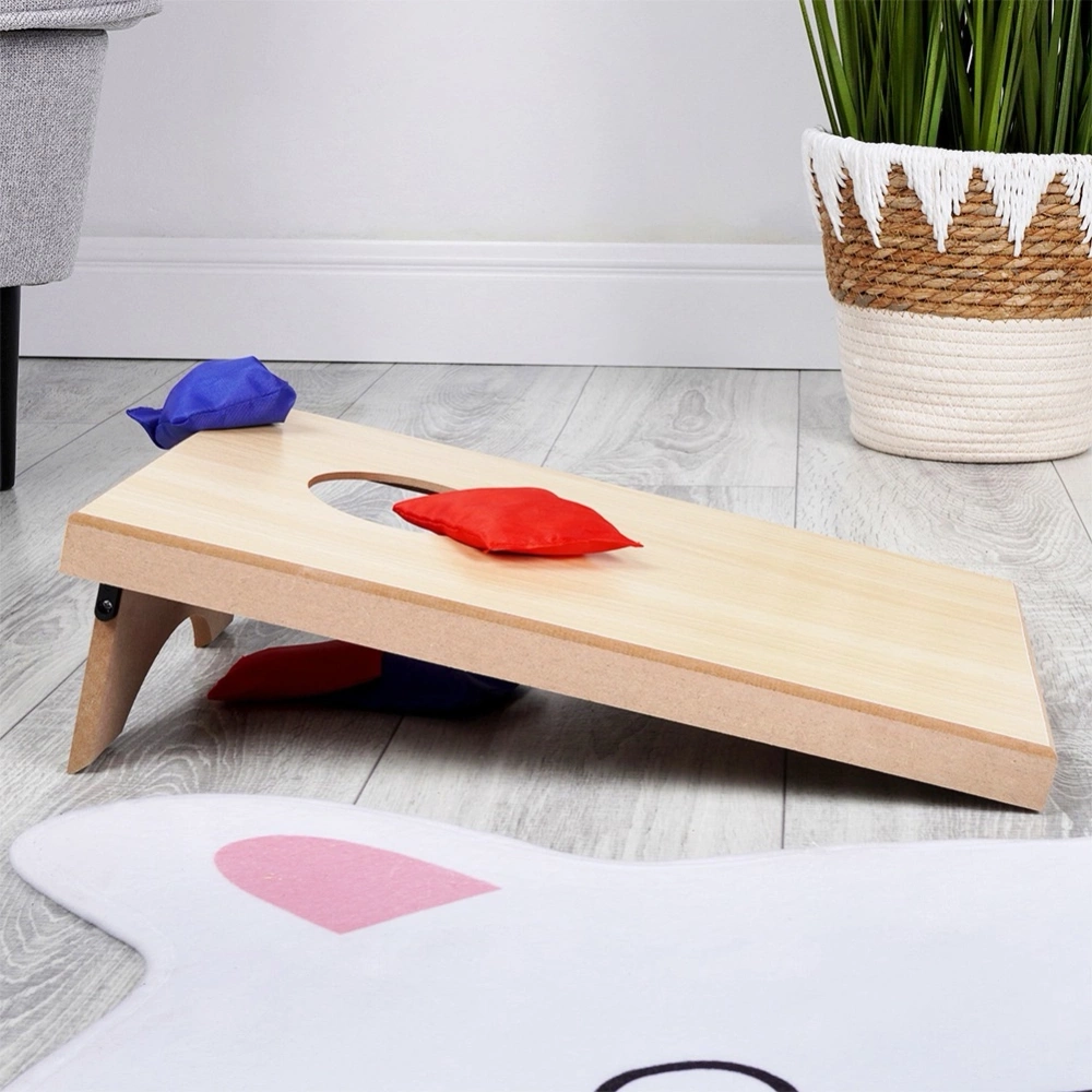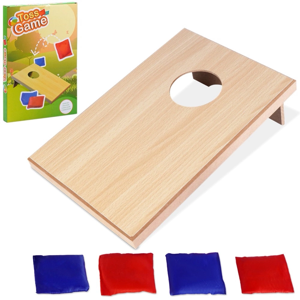 - Gra zręcznościowa - Gra zręcznościowa w rzucanie woreczków do celu jest idealną formą rozrywki dla całej rodziny. W skład zestawu wchodzą cztery woreczki w dwóch różnych kolorach oraz tablica z otworem. Każdy woreczek ma wymiary 8 x 8 cm. Tablica ma wymiary 39 x 26 x 11 cm, a średnica otworu wynosi 9 cm.