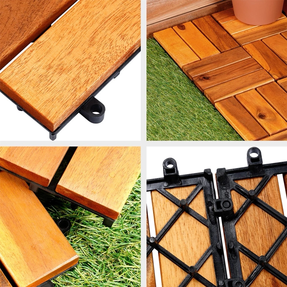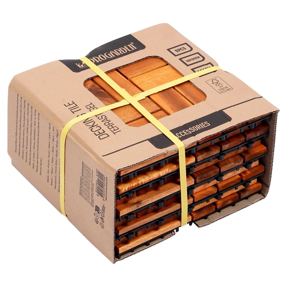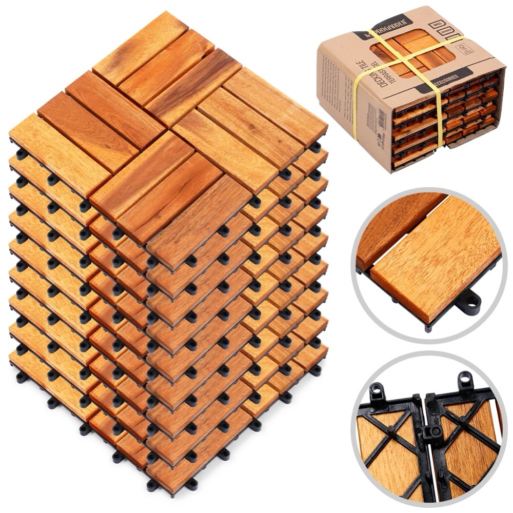 - Płytki tarasowe wykonane z drewna akacjowego. Przeznaczone do montażu na balkonie lub tarasie. Zestaw zawiera 9 płytek o wymiarach 30 x 30 cm.