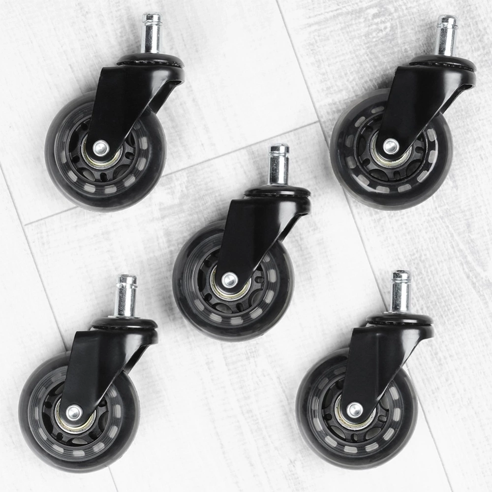 - Zestaw pięciu kółek do fotela biurowego. Średnica kółka wynosi 6,3 cm a średnica trzpienia 10 mm. Kółka wykonane z kauczuku, zapewnią ciche przesuwanie fotela oraz ochronią podłogę.
