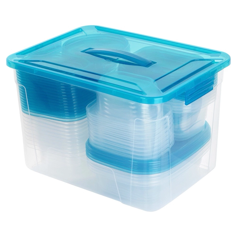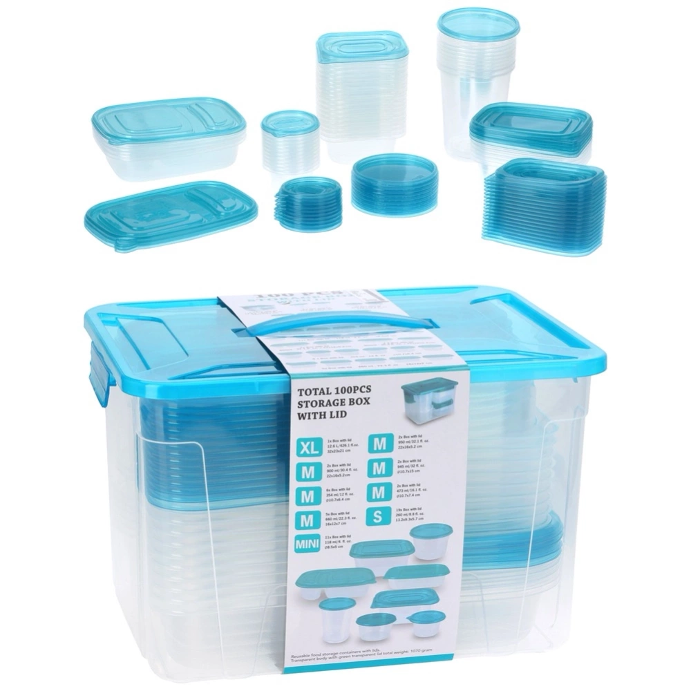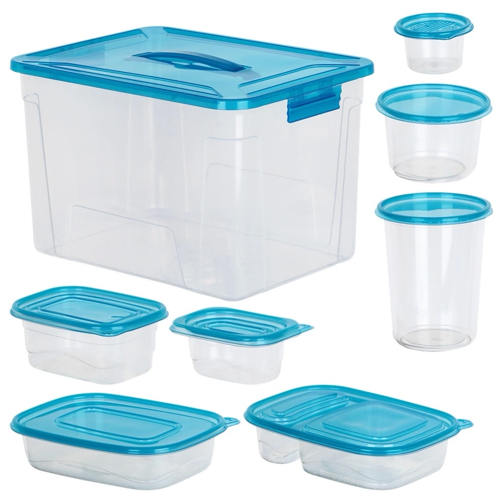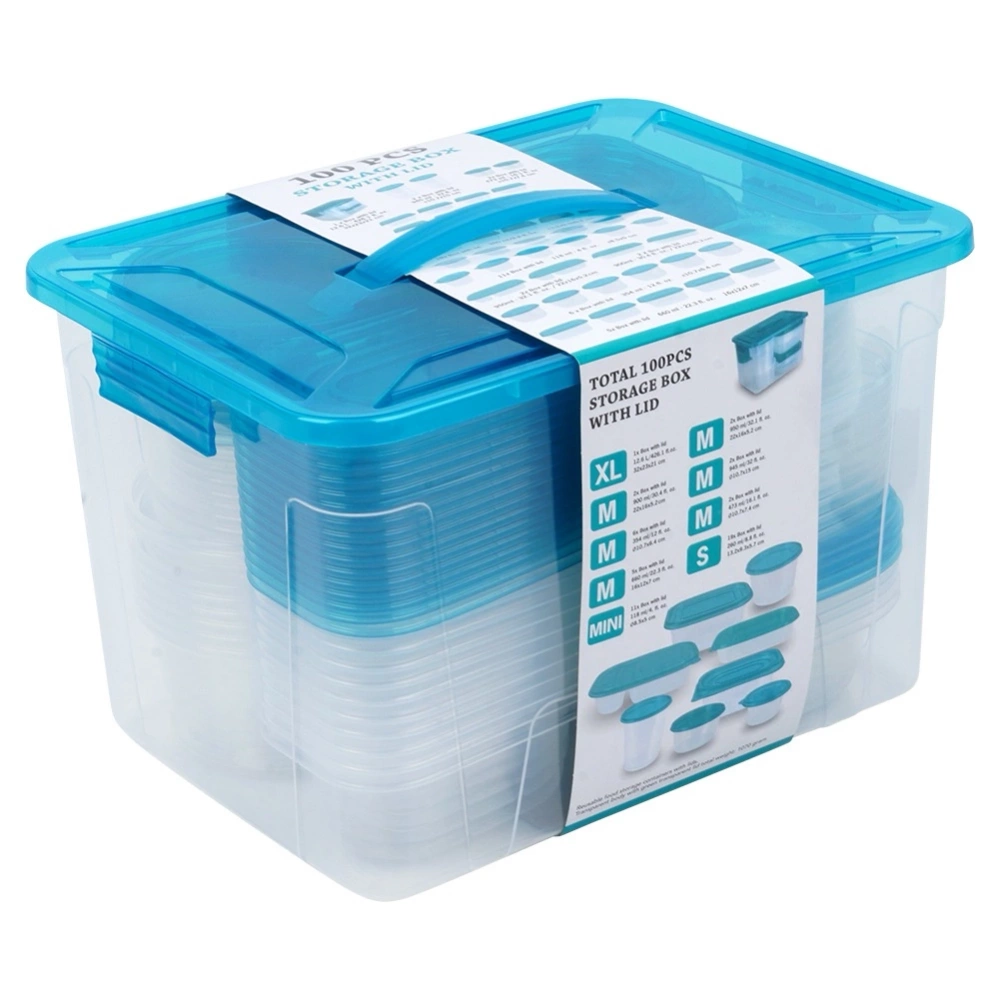 - Zestaw 50 pojemników na żywność - Zestaw 50 szt. pojemników kuchennych z pokrywkami do przechowywania żywności i produktów sypkich. W zestawie pojemniki w dziewięciu różnych rozmiarach. Pojemniki można wygodnie przechowywać umieszczając je w największym pojemniku z uchwytem.