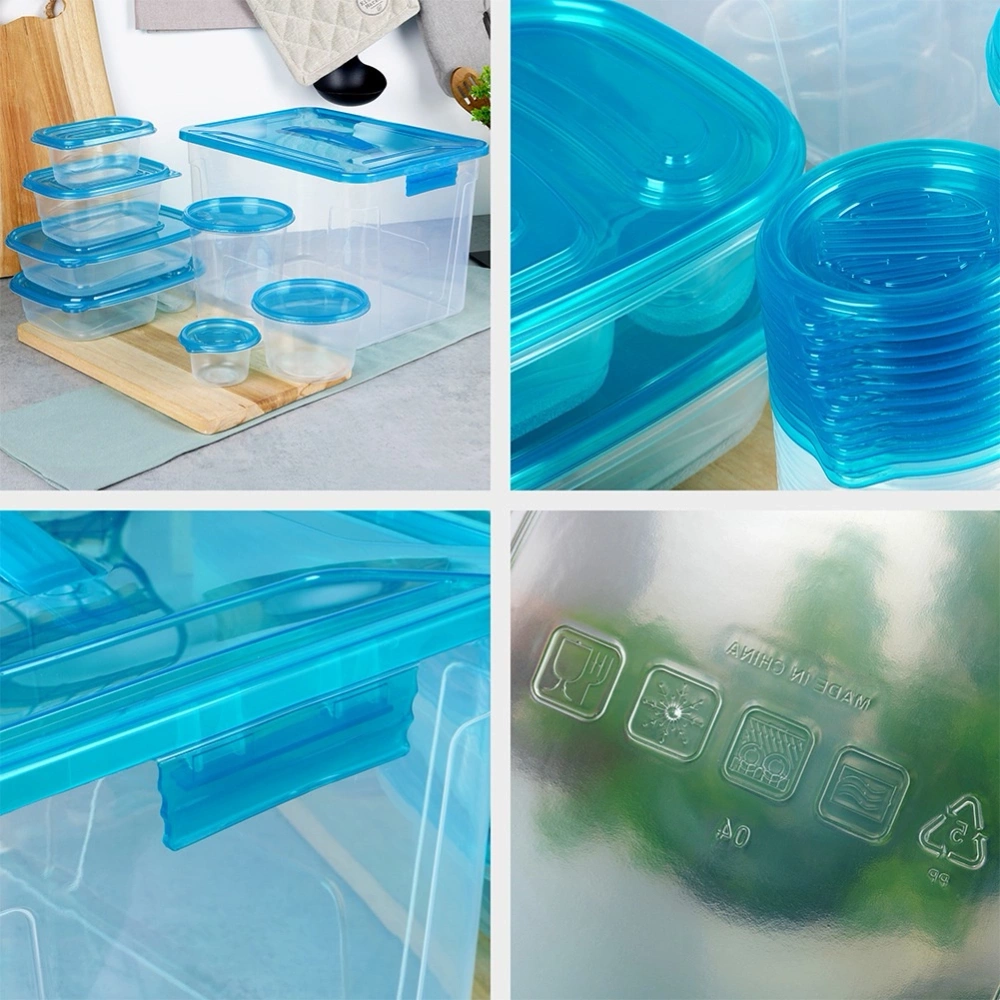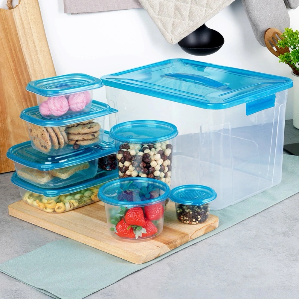 Zestaw pojemników kuchennych w różnych rozmiarach. W zestawie: 1x duży pojemnik z uchwytem o wymiarach 32 x 23 x 21 cm i pojemności 12,6 l, 2x pojemnik lunchbox o wymiarach 22 x 16 x 5 cm i pojemności 950 ml, 2x okrągły pojemnik o średnicy 10,5 cm, wysokości 15 cm i pojemności 945 ml, 2x pojemnik o wymiarach 22 x 16 x 5 cm i pojemności 900 ml, 2x okrągły pojemniko średnicy 10,5 cm, wysokości 7,5 cm i pojemności 473 ml, 6x okrągły pojemnik o średnicy 10,5 cm, wysokości 6,4 cm i pojemności 354 ml, 5x pojemnik o wymiarach 16 x 12 x 7 cm i pojemności 660 ml, 19x pojemnik o wymiarach 13 x 9,3 x 5,7 cm i pojemności 260 ml, 11x okrągły pojemnik o średnicy 8,5 cm, wysokości 5 cm i pojemności 118 ml. Przydatne w każdej kuchni. Pozwolą na odpowiednie przechowywanie produktów, wprowadzając ład i porządek do kuchni. Wyprodukowano zgodnie z europejskimi standardami.