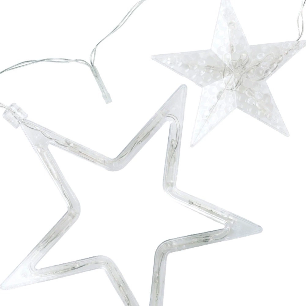 - Kurtyna świetlna 120 LED - Kurtyna świetlna na której zawieszone są gwiazdki w dwóch rozmiarach. Kurtyna z gwiazdkami ma długość 2,5 metra, łączna długość kurtyny z kablem zasilającym wynosi 4 metry (długość kabla zasilającego wynosi 1,5 metra). Do zastosowania wewnątrz i na zewnątrz pomieszczeń.
