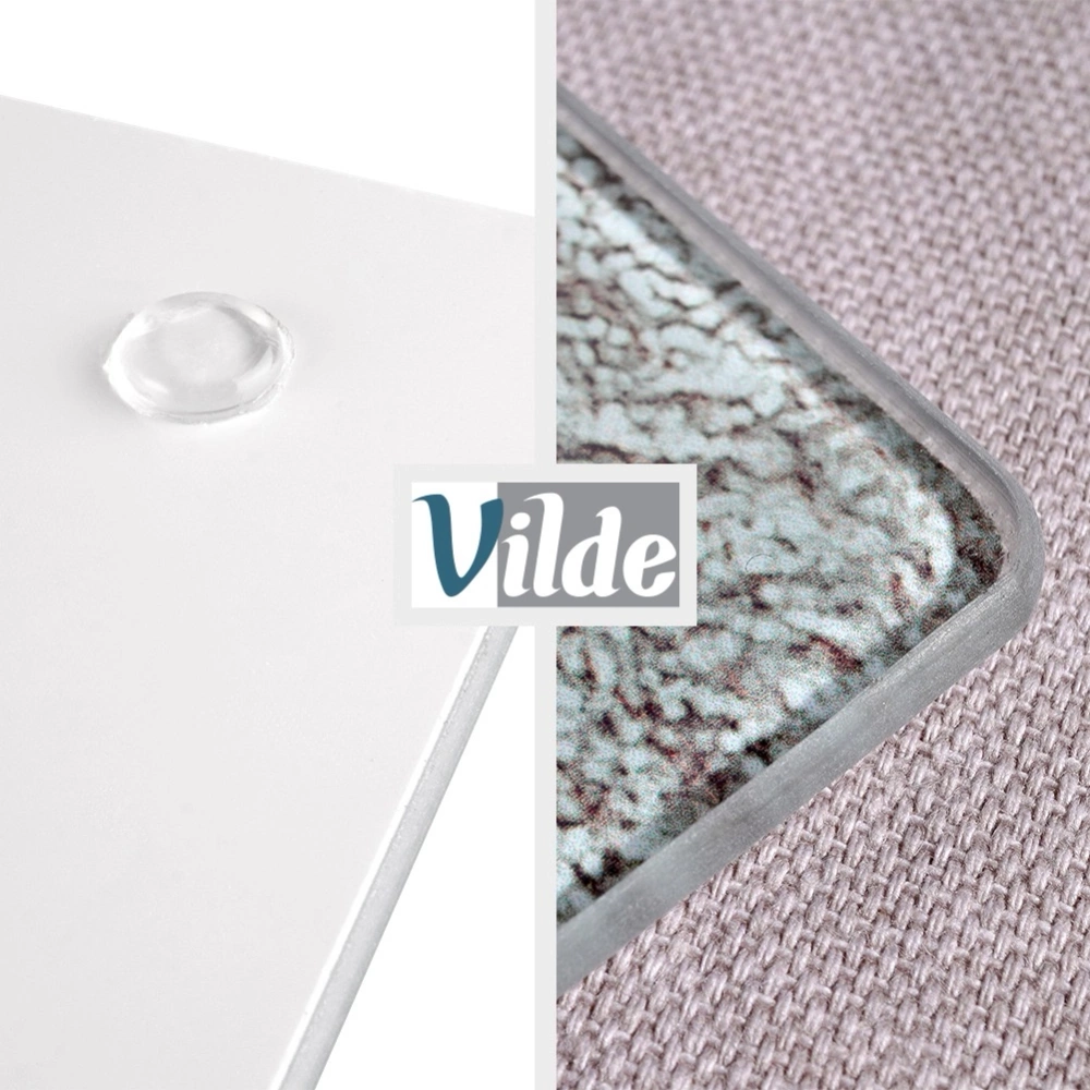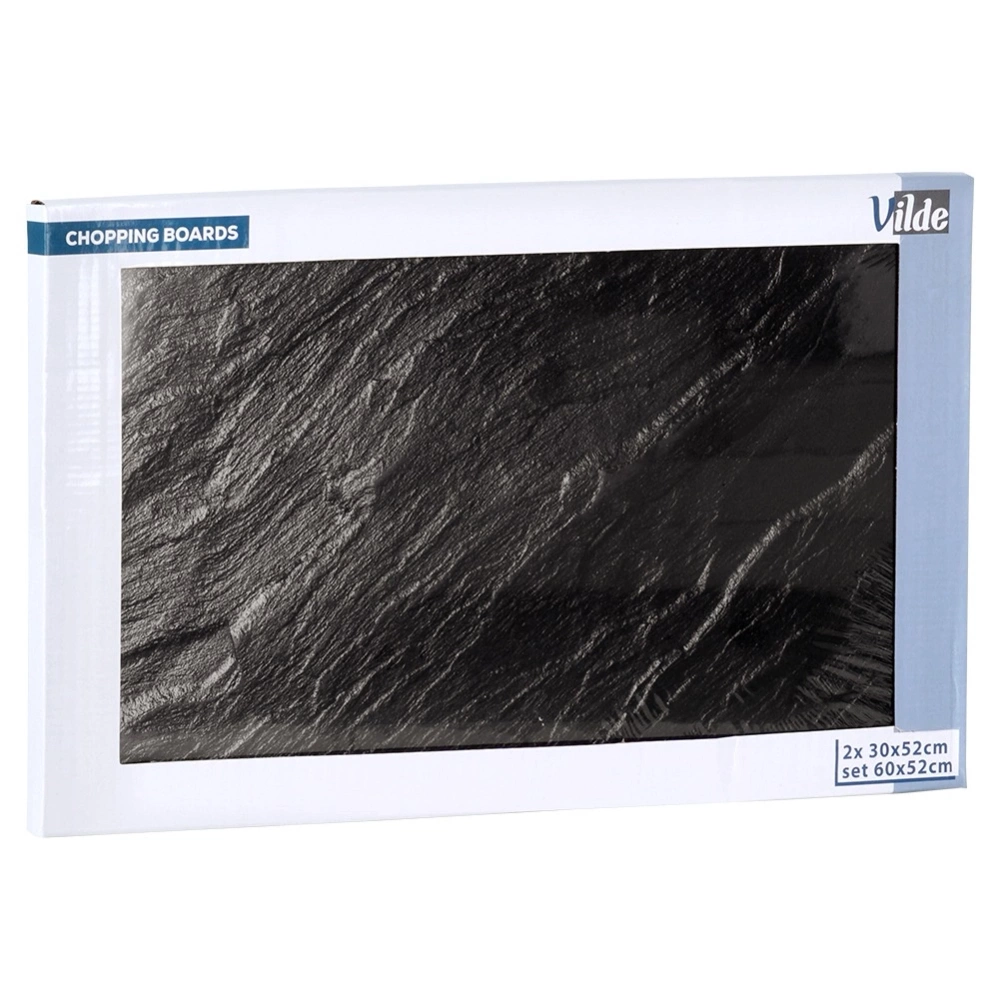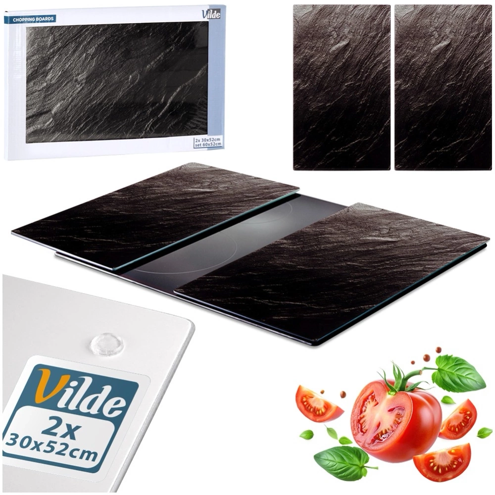 Zestaw dwóch szklanych desek do krojenia. Posiadają prostokątny kształt oraz efektowny dekor. Deski są łatwa w czyszczeniu i wygodne w użytkowaniu, dzięki antypoślizgowym nóżkom. Posiadają dużą powierzchnie krojenia. Niezbędne w każdej kuchni. Dzięki deskom utrzymamy blat w czystości i ochronimy go przed zarysowaniami. Oryginalny produkt marki Vilde. Wyprodukowano zgodnie z europejskimi standardami.