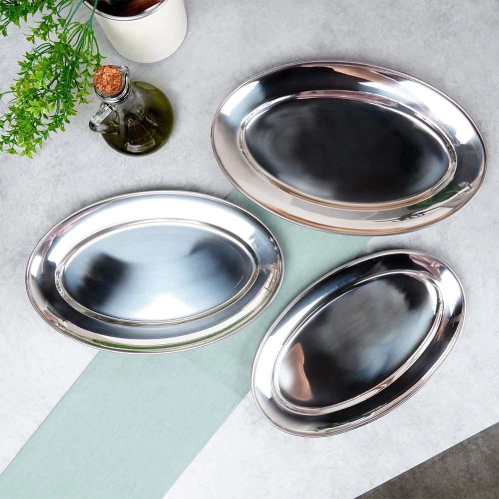 - Zestaw 3 szt. półmisków - Zestaw trzech tac do serwowania przekąsek, przystawek, dań, kanapek. Każda z tac jest w owalnym kształcie. Duża taca ma wymiary 34 x 21,5 cm, średnia taca ma wymiary 32 x 20 cm, mała taca ma wymiary 29 x 18 cm.