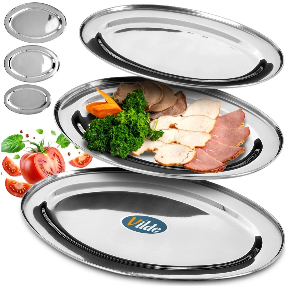 Zestaw trzech tac do serwowania w owalnym kształcie. Nadają się do podawania różnego rodzaju potraw, od mięs i serów po owoce i ciasta. Można je wykorzystać zarówno podczas codziennych posiłków, jak i eleganckich przyjęć. Oryginalny produkt marki Vilde. Wyprodukowano zgodnie z europejskimi standardami.