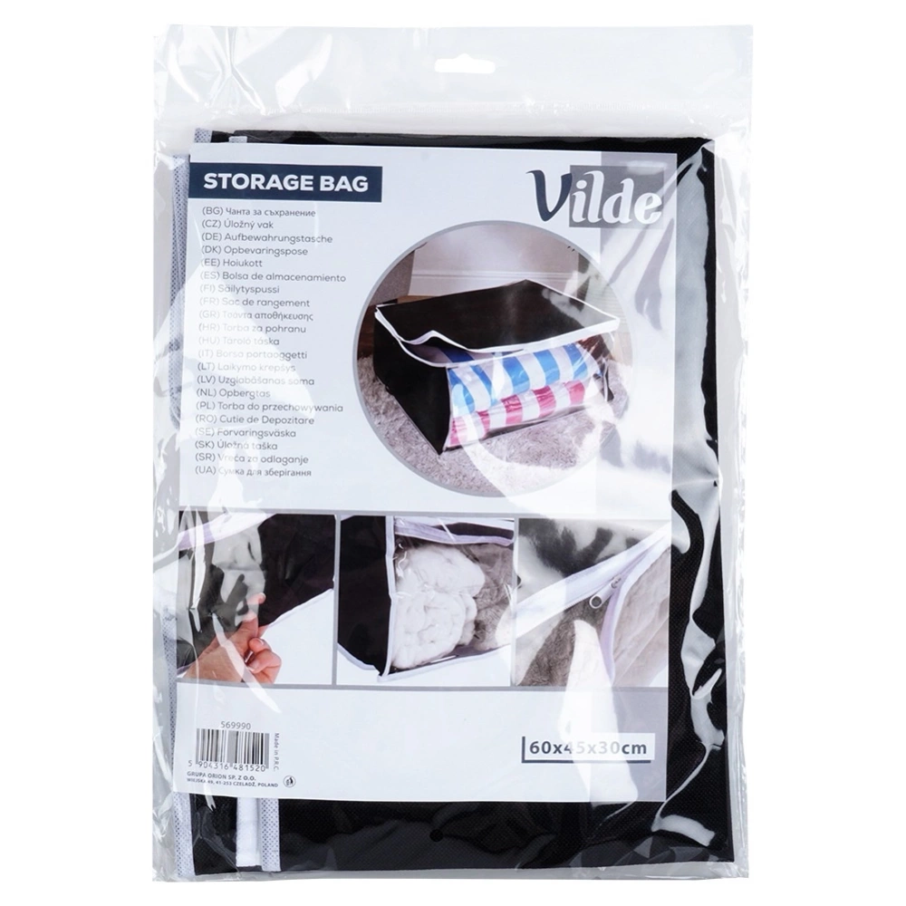 Przydatny pokrowiec na pościel. Wykonany z wytrzymałych materiałów. Sprawdzi się do przechowywania koców, poduszek, ale również ubrań i innych tekstyliów. Pokrowiec jest zamykany, więc ochroni przechowywane rzeczy przed zawilgoceniem oraz molami. Z jego pomocą możemy odpowiednio wygospodarować przestrzeń w szafie lub pod łóżkiem. Oryginalny produkt marki Vilde. Wyprodukowano zgodnie z europejskimi standardami.