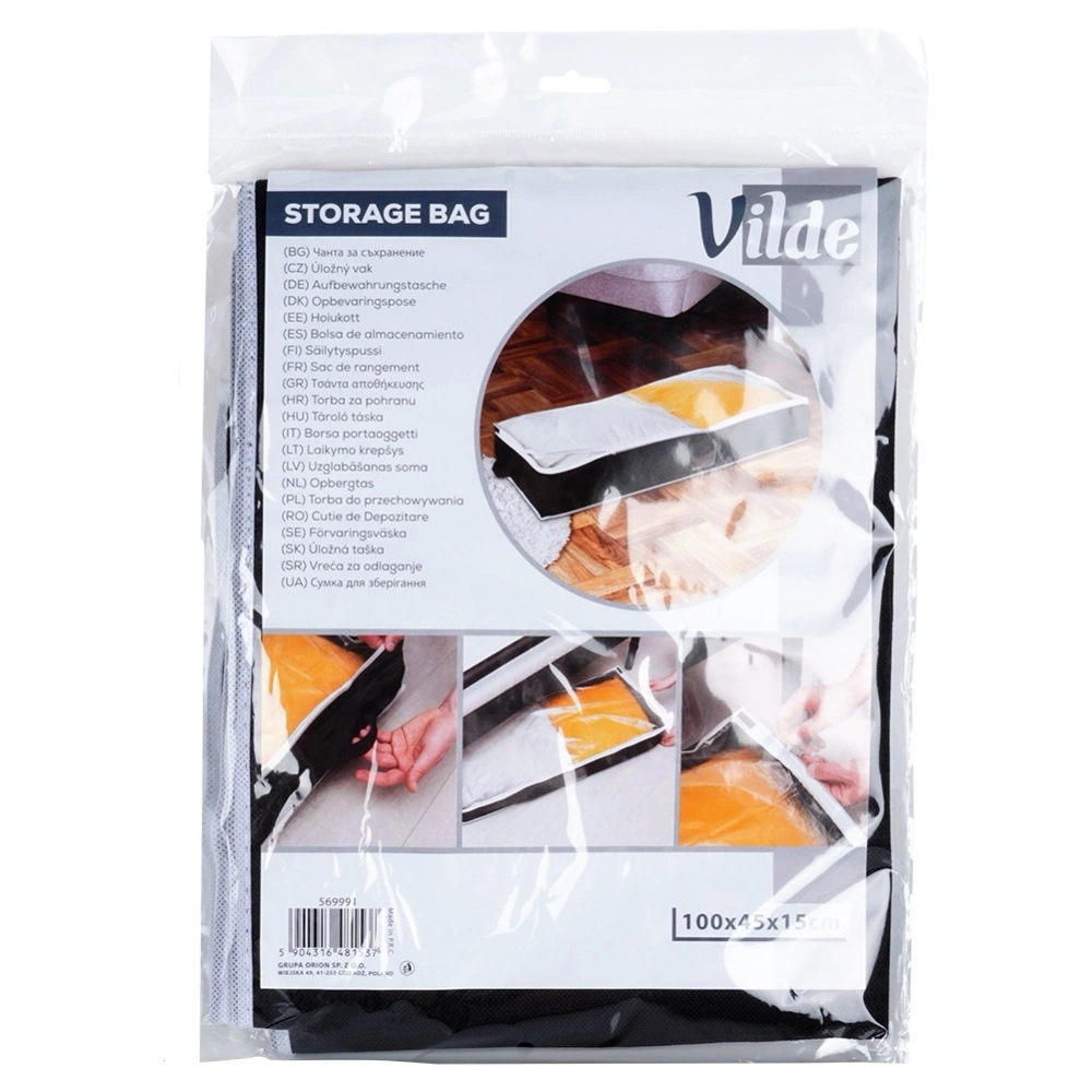 Przydatny pokrowiec na pościel. Wykonany z wytrzymałych materiałów. Sprawdzi się do przechowywania koców, poduszek, ale również ubrań i innych tekstyliów. Pokrowiec jest zamykany, więc ochroni przechowywane rzeczy przed zawilgoceniem oraz molami. Z jego pomocą możemy odpowiednio wygospodarować przestrzeń w szafie lub pod łóżkiem. Oryginalny produkt marki Vilde. Wyprodukowano zgodnie z europejskimi standardami.