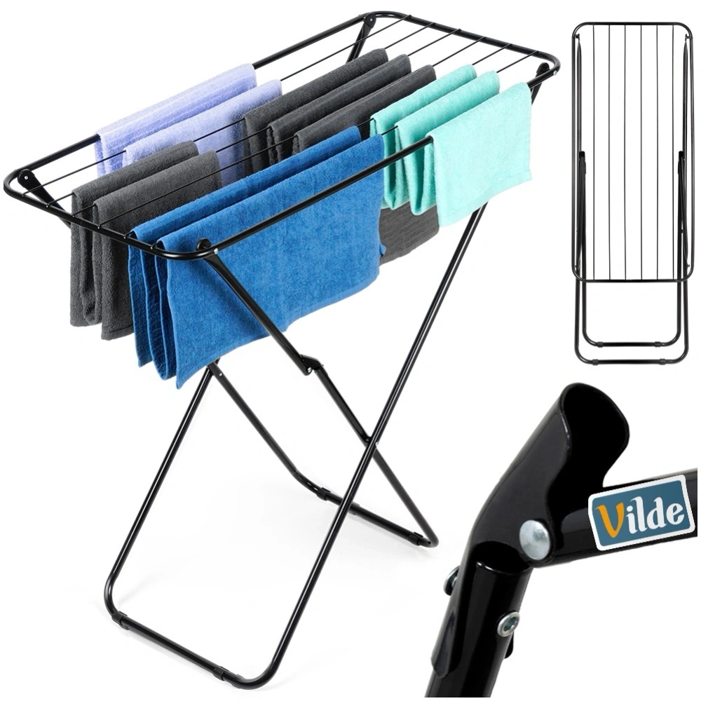 Suszarka na pranie składana na płasko. Suszarka wykonana z solidnych materiałów, utrzymana w modnej, czarnej kolorystyce. Dzięki funkcji składania suszarka po złożeniu nie zajmuje dużo miejsca. Niezbędna w każdym domu. Odpowiednio użytkowana posłuży długie lata. Oryginalny produkt marki Vilde. Wyprodukowano zgodnie z europejskimi standardami.