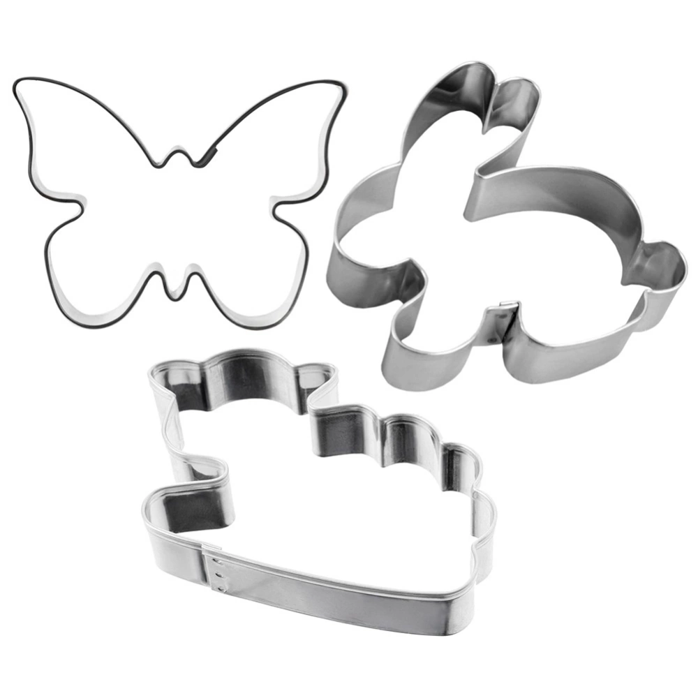 - Zestaw 3 szt. wykrawaczy do ciastek - Komplet wykrawaczy cukierniczych w kształcie zajączka, motylka oraz baranka. Idealne do przygotowania ciasteczek i pierników.