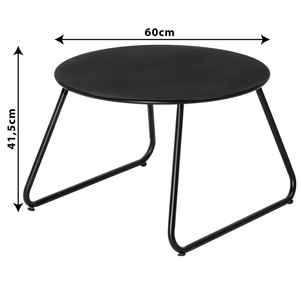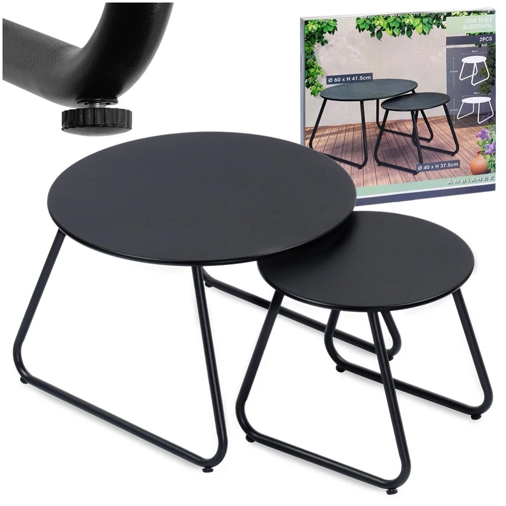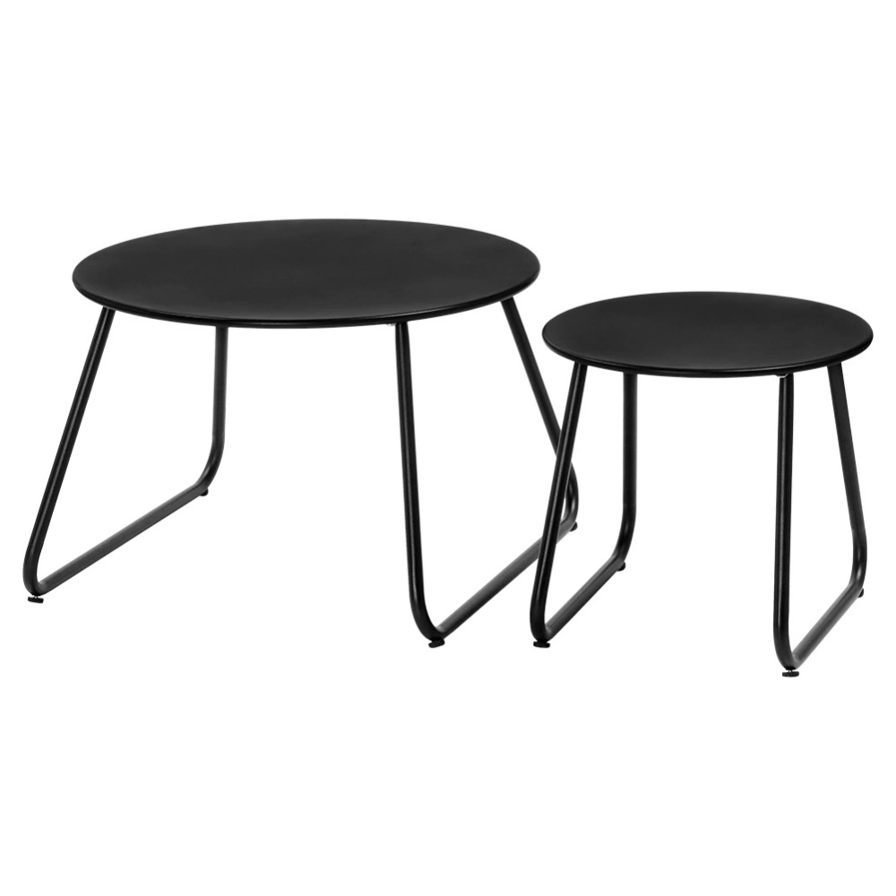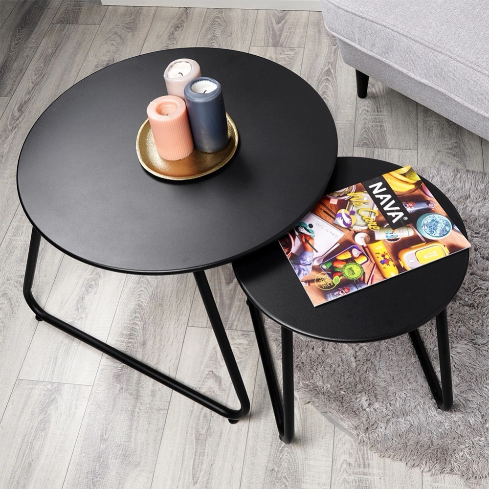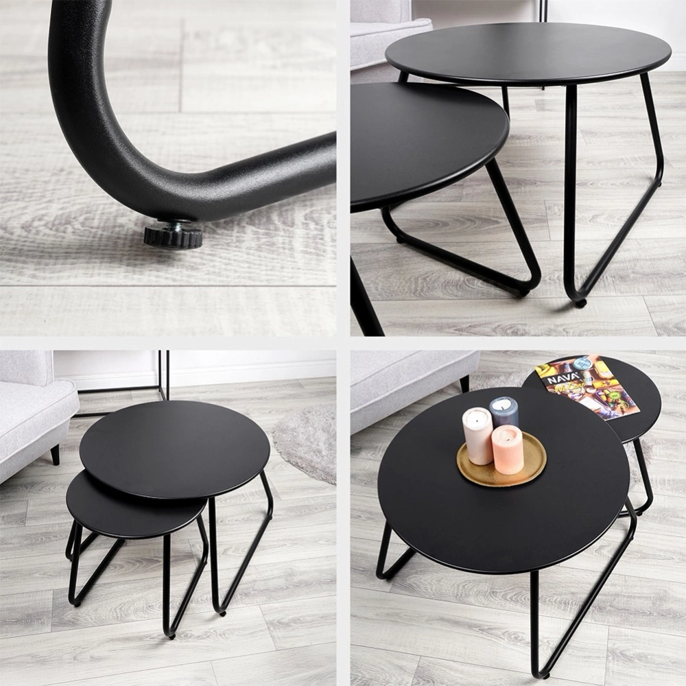 - Zestaw dwóch stolików kawowych w dwóch rozmiarach. Wykonane z metalu w czarnym kolorze. Jeden stolik można umieścić pod drugim.