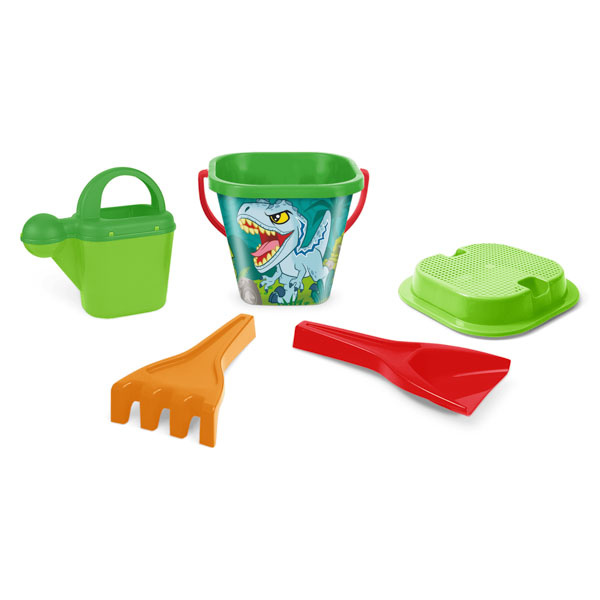 Komplet letni z wizerunkami postaci z bajki Jurassic World Explorers składa się z 5 elementów: wiaderka o pojemności 2 litrów, łopatki, grabek, sitka i konewki