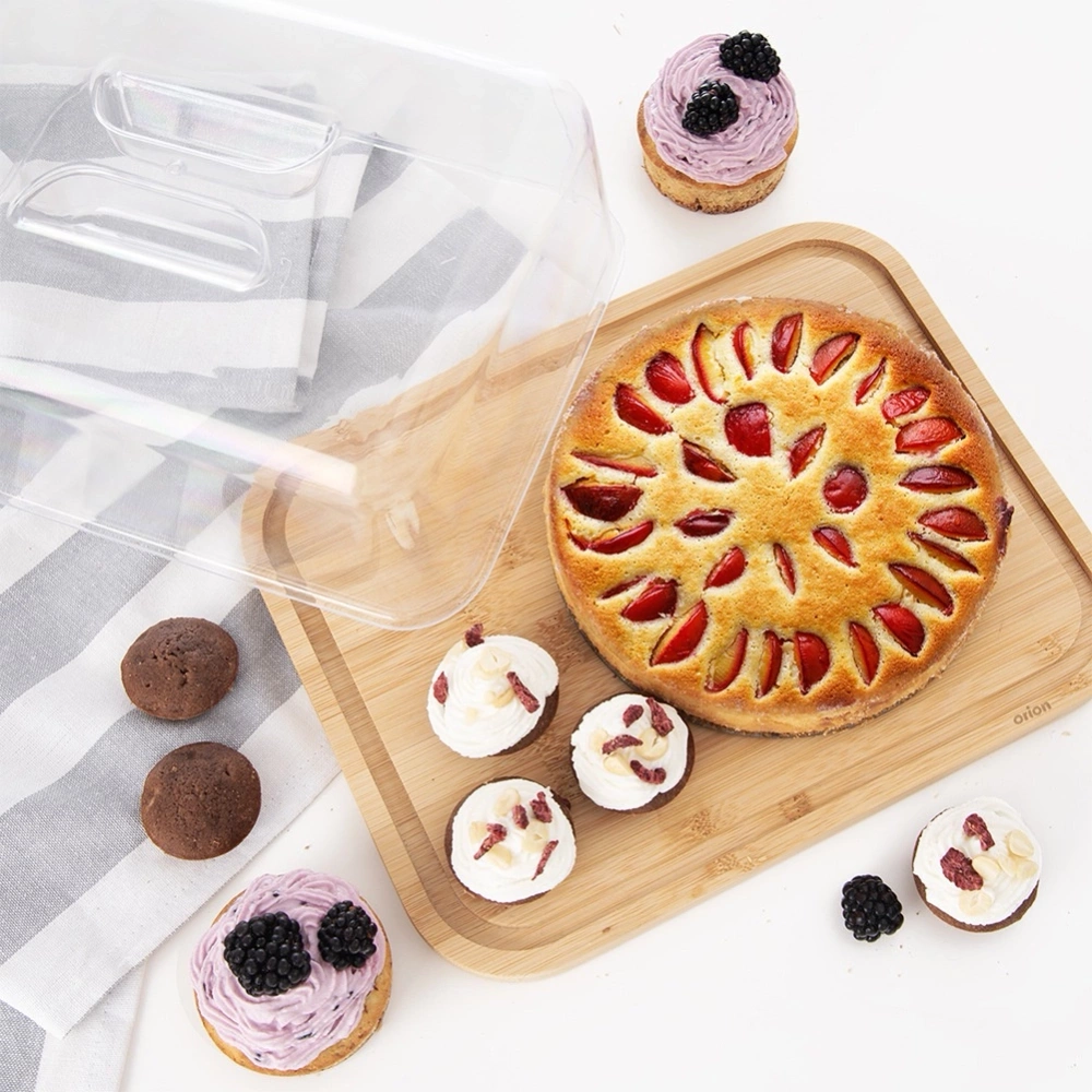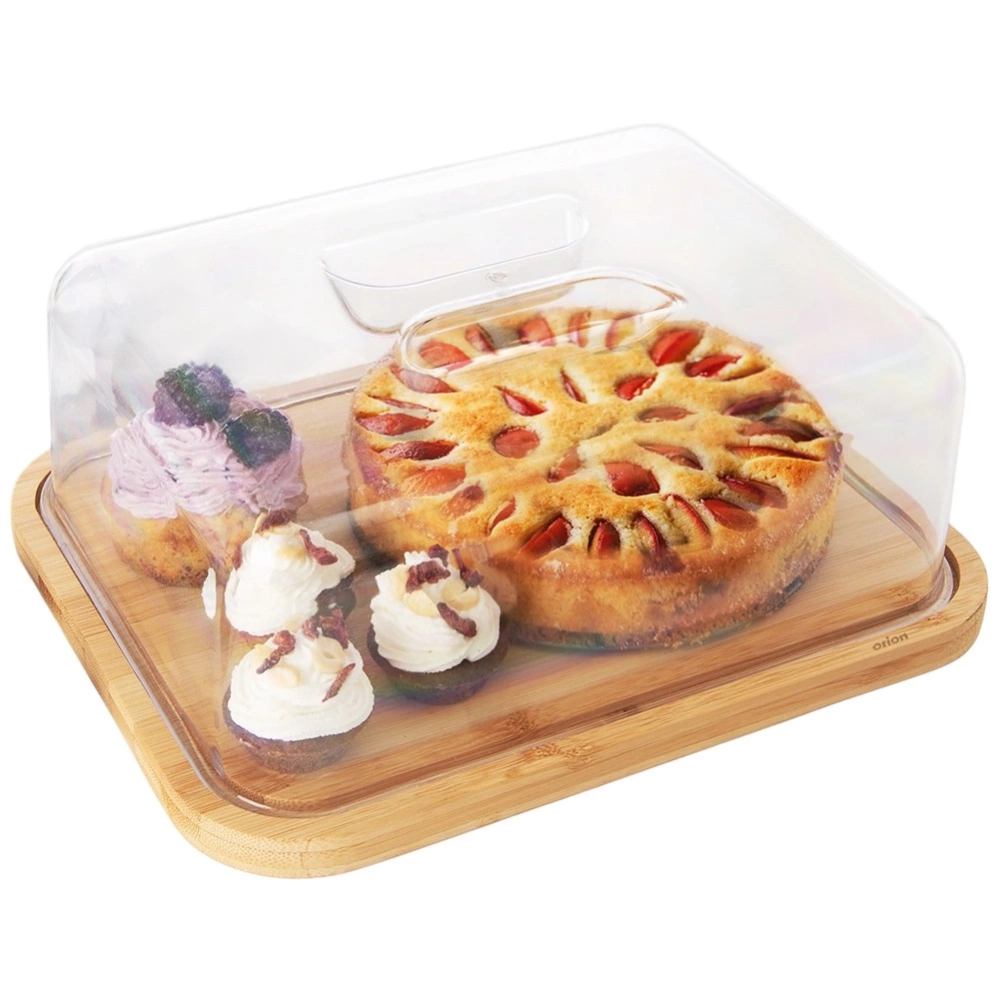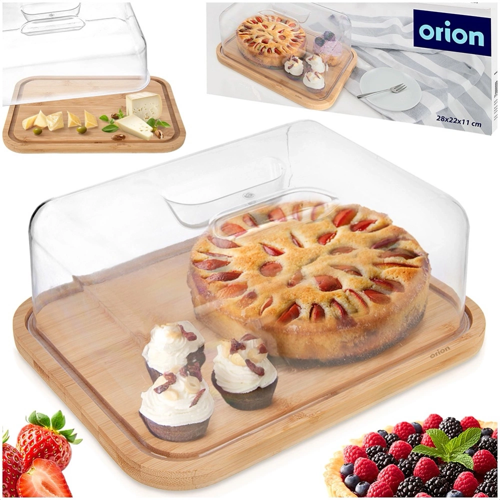 - Prostokątna deska bambusowa z przezroczystym kloszem do serwowania oraz przechowywania serów, wędlin, przekąsek, przystawek, kanapek czy deserów.