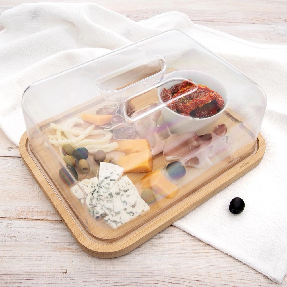 - Prostokątna deska bambusowa z przezroczystym kloszem do serwowania oraz przechowywania serów, wędlin, przekąsek, przystawek, kanapek czy deserów.