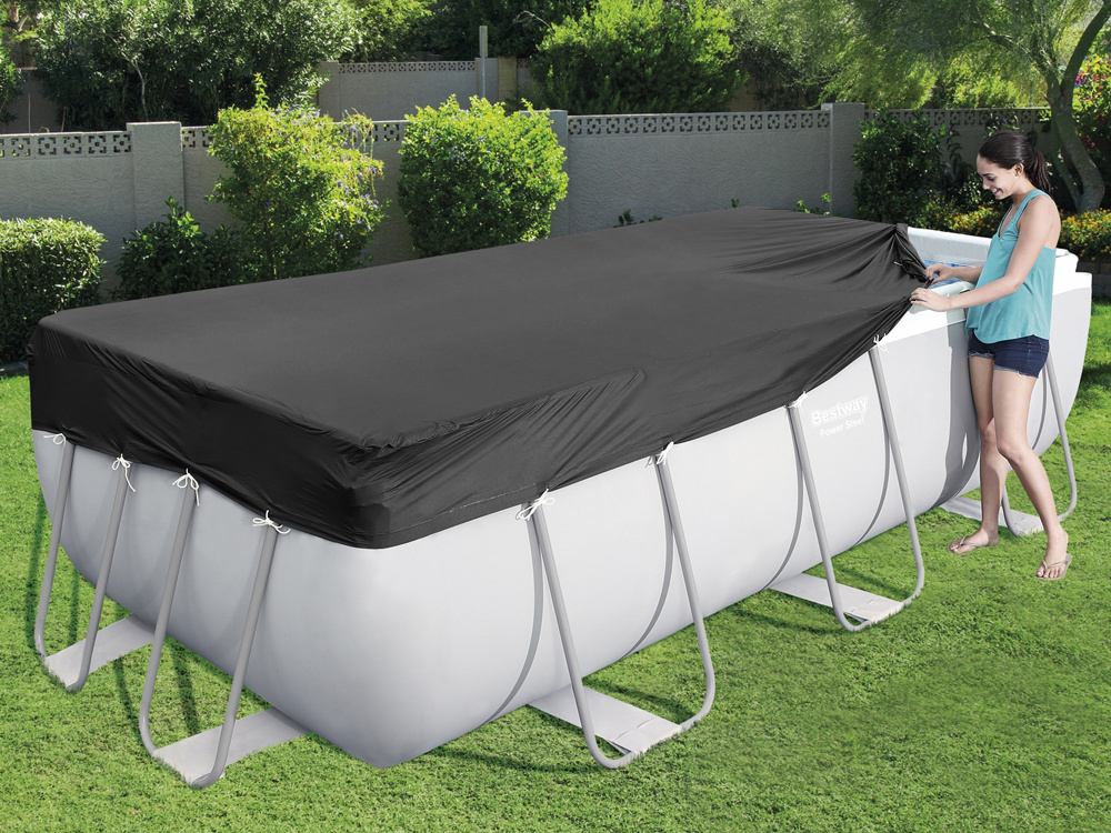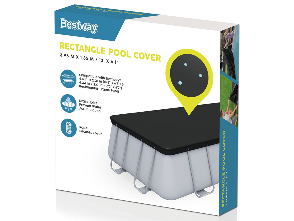 Uniwersalna pokrywa na basen Bestway, idealna do basenów stelażowych prostokątnych o wymiarach 412 x 201cm oraz 404 x 201cm. Pokrywa na basen Bestway zapewnia jego ochronę przed owadami, ptakami, liśćmi i niewielkim deszczem. Jest również dodatkowym zabezpieczeniem przed przypadkowym wpadnięciem do basenu dzieci. Stanowi dodatkową izolację termiczną wody w basenie. Dzięki linkom umożliwiającym jej umocowanie, wiatr jej nie zerwie, a otwory odpływowe skutecznie odprowadzą nadmiar zbierającej się wody. Wykonanie pokrywy z bardzo trwałego i mocnego materiału PCV pozwoli na używanie jej przez wiele sezonów.