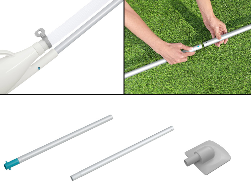 DUŻY ZASIĘG – rura ssąca o długości 6m i trzonek o długości 1,9m umożliwiają sprawne czyszczenie dna basenu.