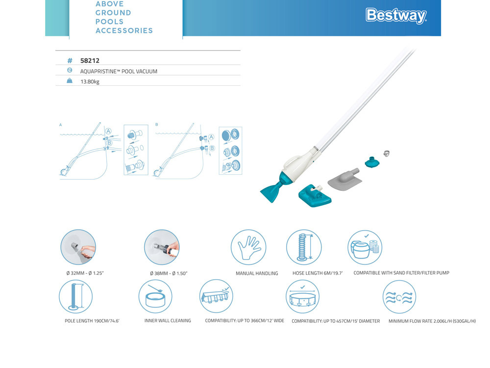 Odkurzacz Bestway® AquaCrawl ™ to zestaw czyszczący przeznaczony do basenów o średnicy do 457 cm jest prosty i łatwy w użyciu. Po prostu podłącz go do pompy filtrującej za pomocą jednego z dołączonych adapterów i rozpocznij czyszczenie. Odkurzacz z łatwością usunie zanieczyszczenia z dna i ścianek basenu jak również powierzchni wody z pływających w niej owadów, liści i innych zanieczyszczeń i co najważniejsze zaoszczędzi Ci sporo czasu sprawiając, że woda będzie krystalicznie czysta. Zestaw do czyszczenia Bestway® zapewni niezbędną pielęgnację Twojego basenu tak abyś miał pewność, że Ty i Twoje dzieci możecie z poczuciem bezpieczeństwa odetchnąć i ochłodzić się w upalne dni.