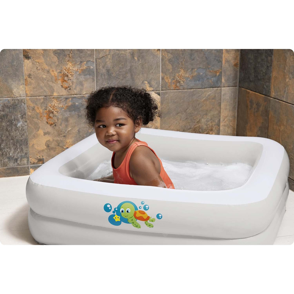 Dodatkowym atutem jest pompowane dno, które zapewnia miękkość i wygodę oraz redukuje ryzyko poślizgu podczas kąpieli. Kształt wanienki w formie kwadratu (86 cm x 86 cm) daje dziecku wystarczającą przestrzeń do swobodnego pluskania się w wodzie.