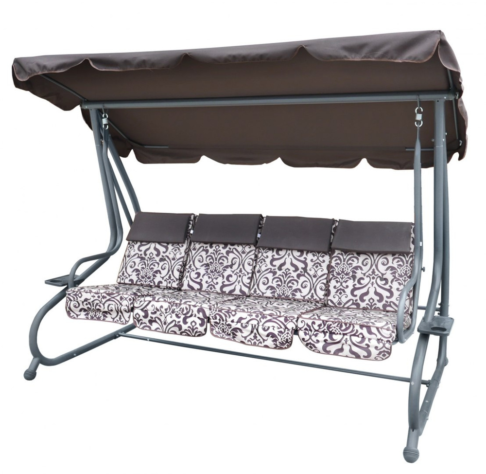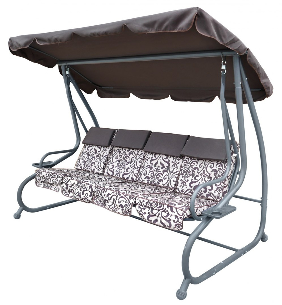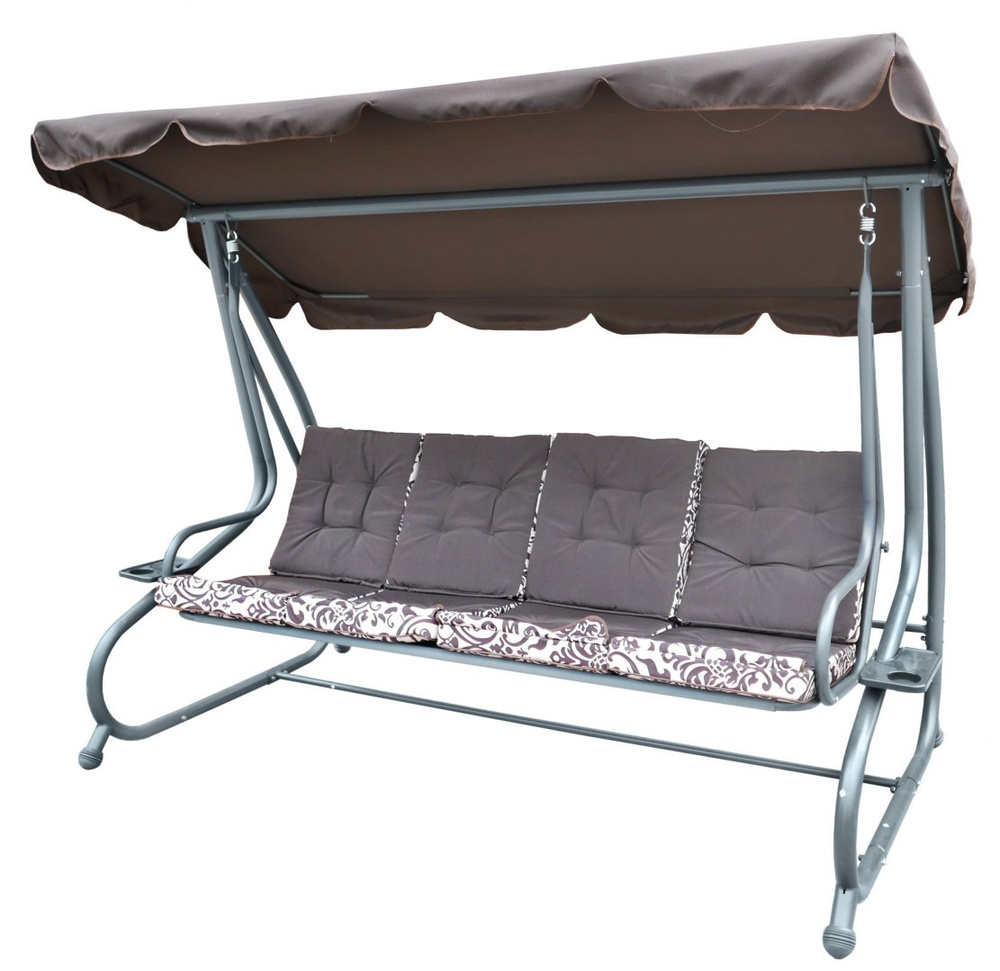 Duża Huśtawka ogrodowa 4-osobowa Brązowy + Tekstylina + Daszek + Regulowane siedzisko + 4 Poduszki