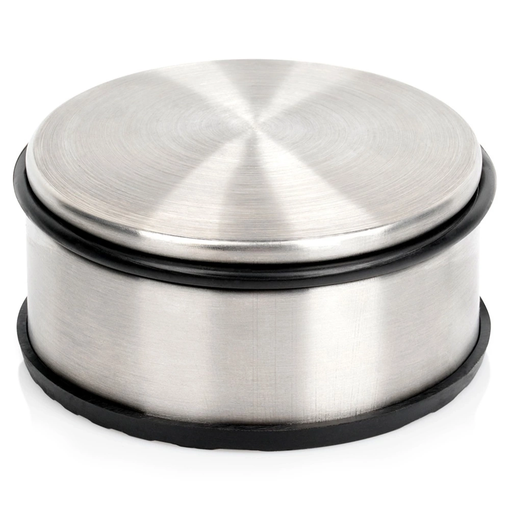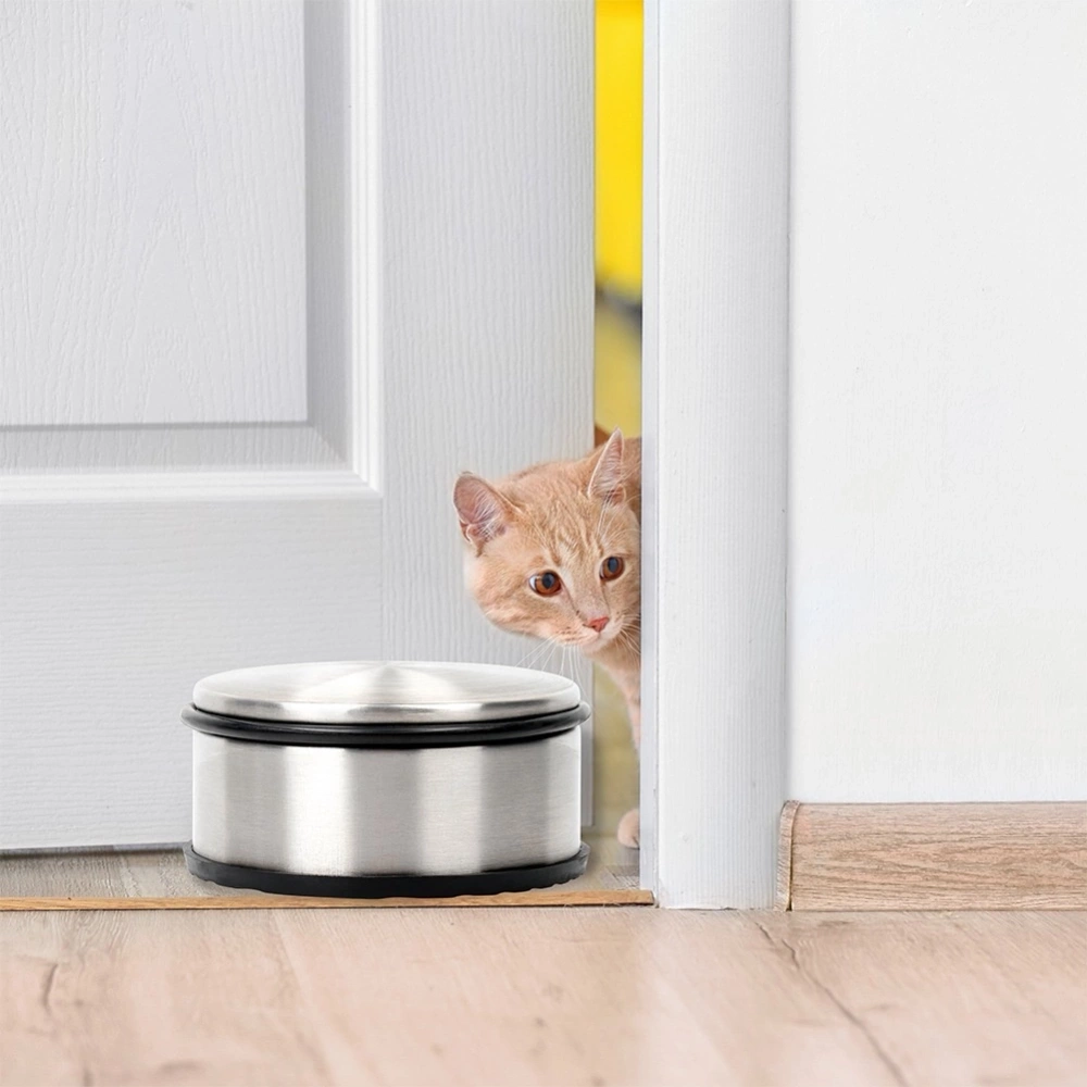 - Stoper do drzwi wykonany ze stali nierdzewnej. Stoper jest ciężki i nie wymaga montażu. Posiada gumowe elementy, które zabezpieczą drzwi oraz podłogę przed uszkodzeniem.