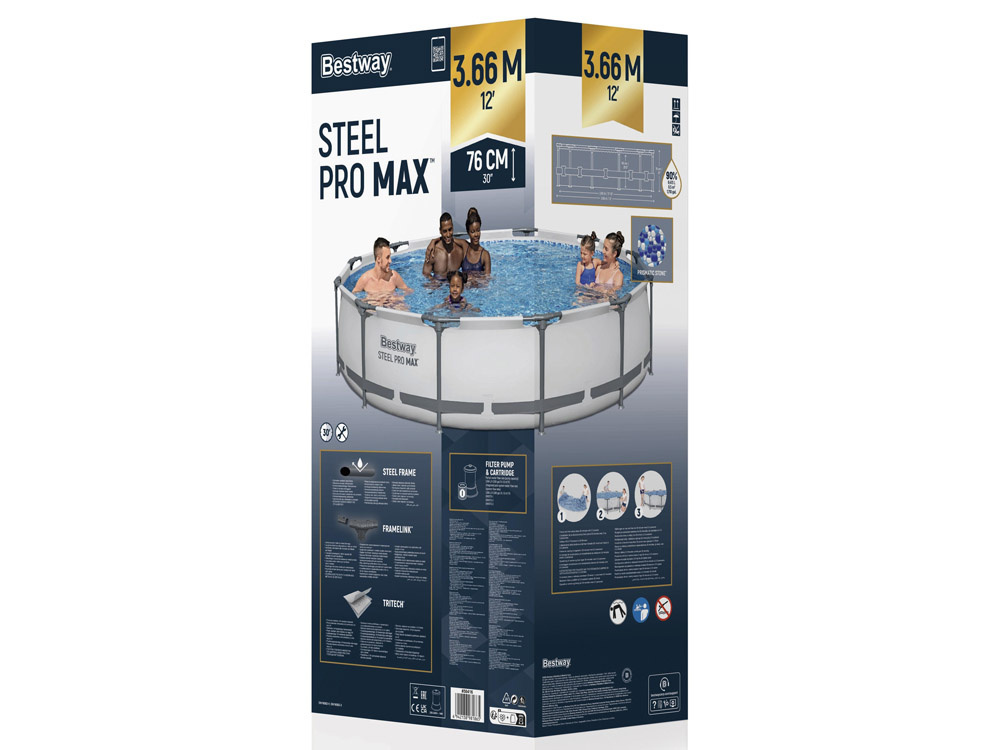 Stelażowy basen ogrodowy STEEL-PRO MAX™ o średnicy 366cm, wysokości 76cm pojemności 6,473l zapewni błogie lenistwo w upalny dzień. Basen wykonany jest z mocnego materiału Tritech™. Jest to materiał z rdzeniem z siatki poliestrowej połączonej z dwiema warstwami PVC o dużej grubości. Zapewnia maksymalną trwałość i odporność na m.in. na działanie chloru oraz promieni słonecznych. Specjalny metalowy stelaż jest odporny na deszcz i zmienne warunki i atmosferyczne. Dzięki zastosowaniu specjalnych łączników FrameLink System™, stelaż jest chroniony przed korodowaniem na łączeniu metal-metal.