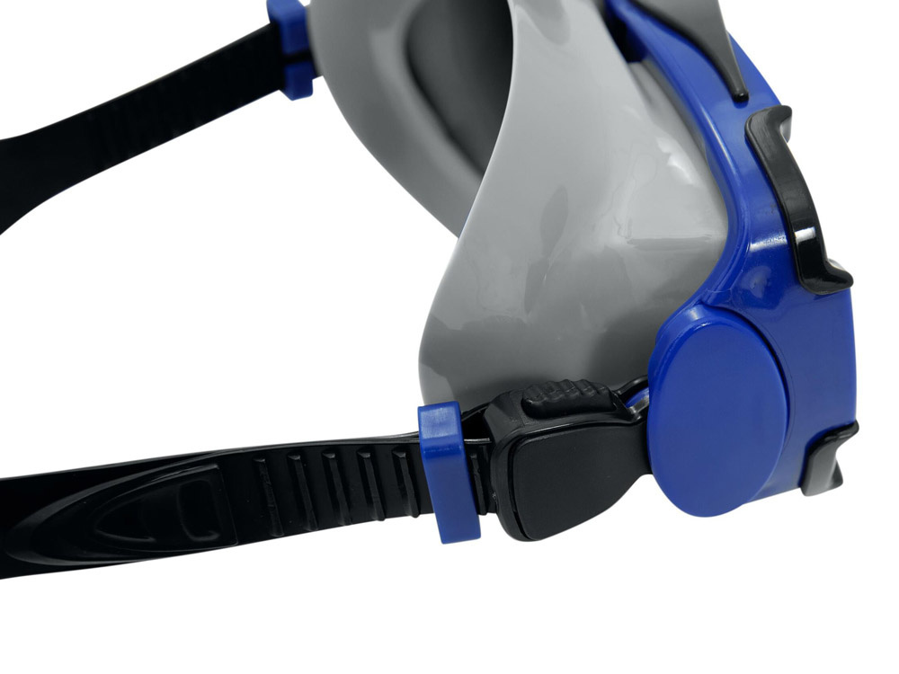 - Regulowany pasek maski: Maska jest wyposażona w regulowany pasek, co umożliwia idealne dopasowanie do głowy użytkownika, zapewniając wygodę i stabilność nawet przy intensywnym pływaniu.