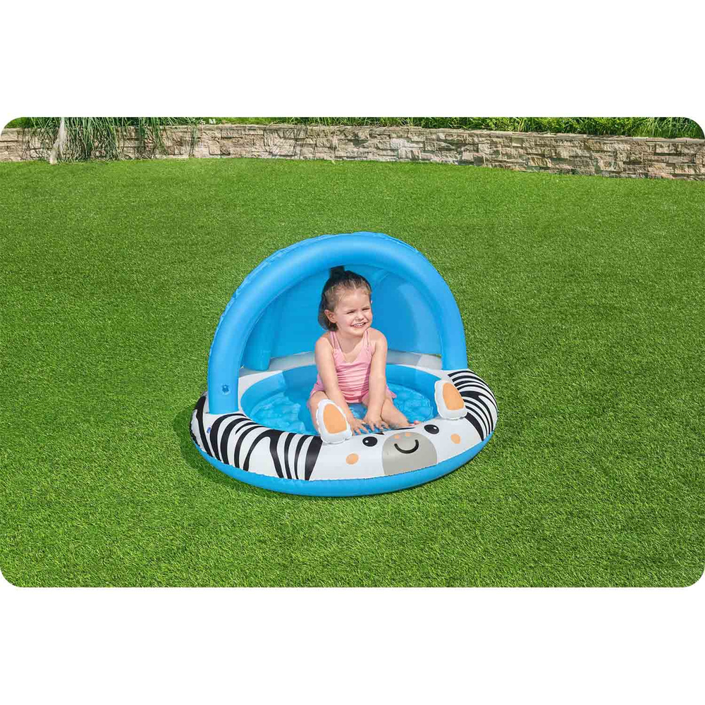 Dmuchany brodzik Bestway® Zebra to doskonałe rozwiązanie dla najmłodszych miłośników wodnej zabawy! Dzięki uroczej grafice radosnej zebry i przyjaznej kolorystyce, basenik przyciągnie uwagę każdego malucha, zapewniając mu komfort i bezpieczeństwo podczas pluskania się w wodzie.