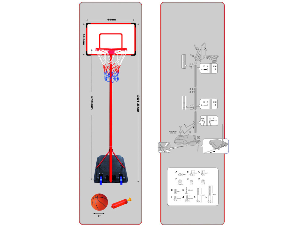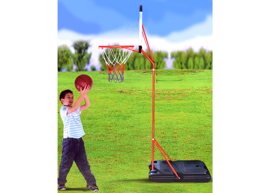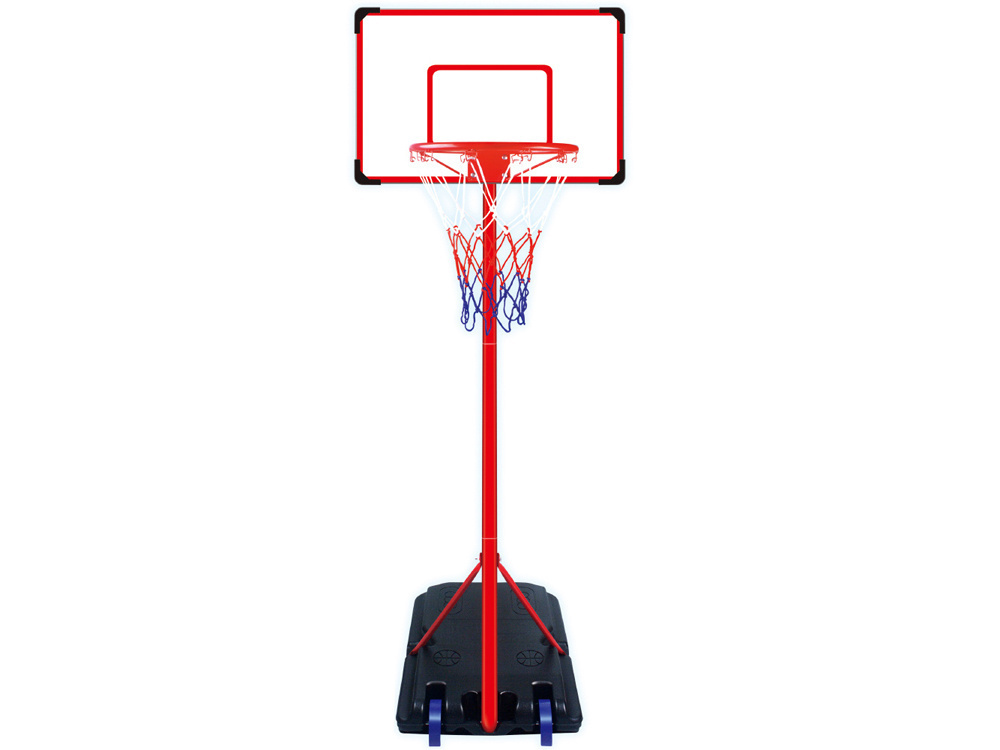 Praktyczny stojak z tablicą do gry w koszykówkę z piłką i pompką w zestawie, gwarantuje rewelacyjną zabawę na świeżym powietrzu. Całość sprawdzi się na szkolnym boisku jak w ogrodzie, czy na placu zabaw. Dzięki mocnej podstawie na kółkach oraz słupie osadzonym w podstawie, gra w kosza będzie prawdziwą przyjemnością dla wszystkich fanów koszykówki. Dzięki zamontowanym kółkom w podstawie będzie można w łatwy sposób przemieścić cały zestaw. Dodatkowo łatwy i szybki montaż oraz regulowana wysokość kosza gwarantują pełny komfort użytkowania.