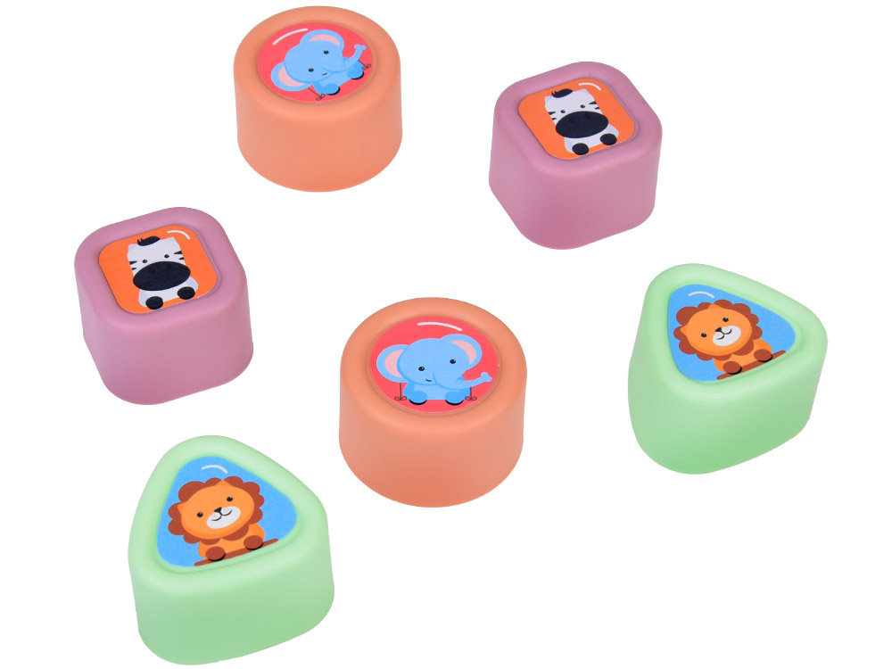 - Pastelowe klocki: sześć klocków z naklejkami (lew, żyrafa, słoń) pozwolą na dopasowywanie ich do sortera.