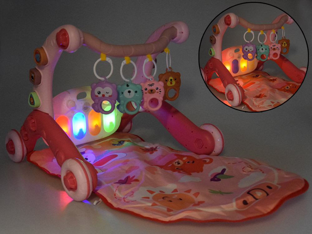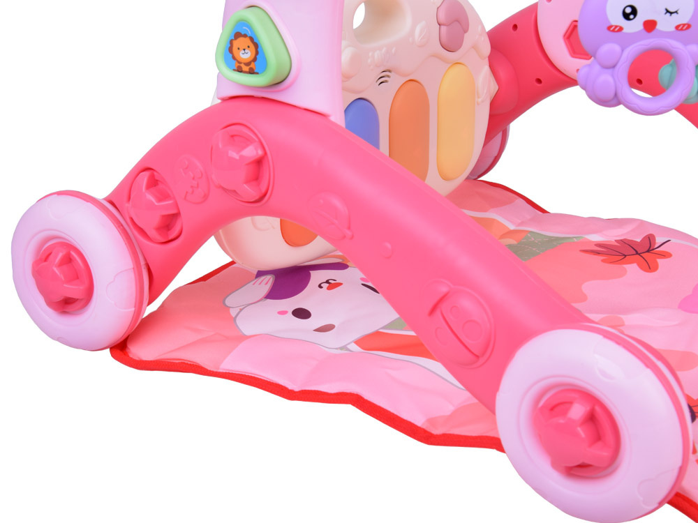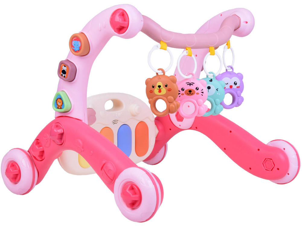 Zabawa i rozwój sensoryczny: Interaktywne pianinko z kolorowymi, podświetlanymi klawiszami i różnymi melodyjkami, dźwiękami, odgłosami śmiechu dziecka rozwija słuch i kreatywność, a kolorowe zawieszki w kształcie zwierzątek zachęcają do chwytania, wzmacniając umiejętności manualne. Pałąk pchacza wyposażony jest także w sorter, który stymuluje dziecko do zabawy w dopasowywanie kształtów za pomocą pastelowych klocków.