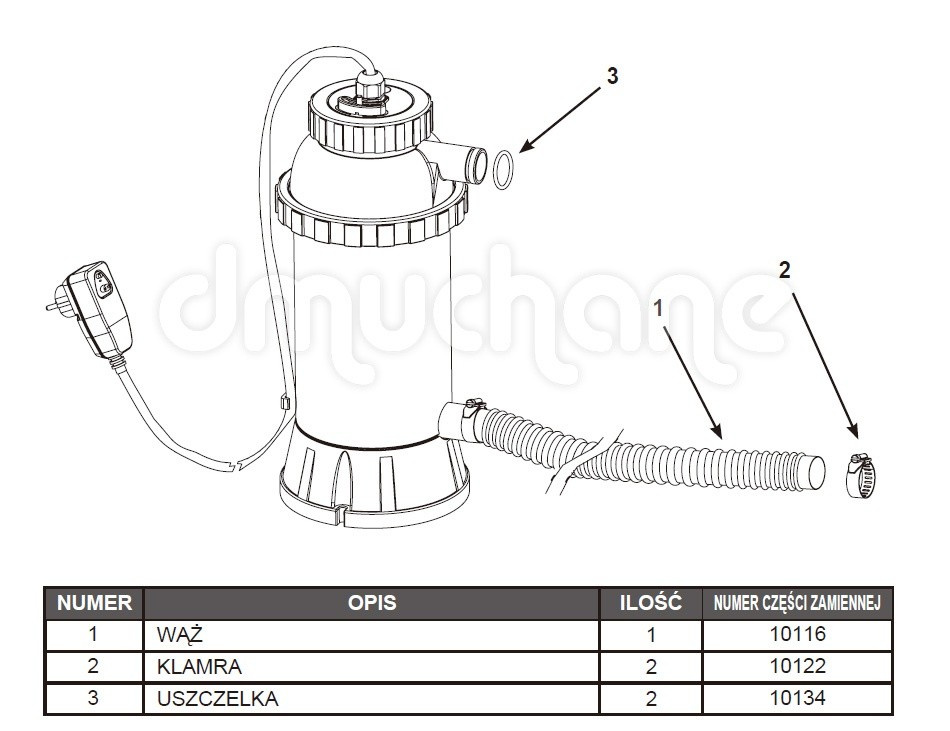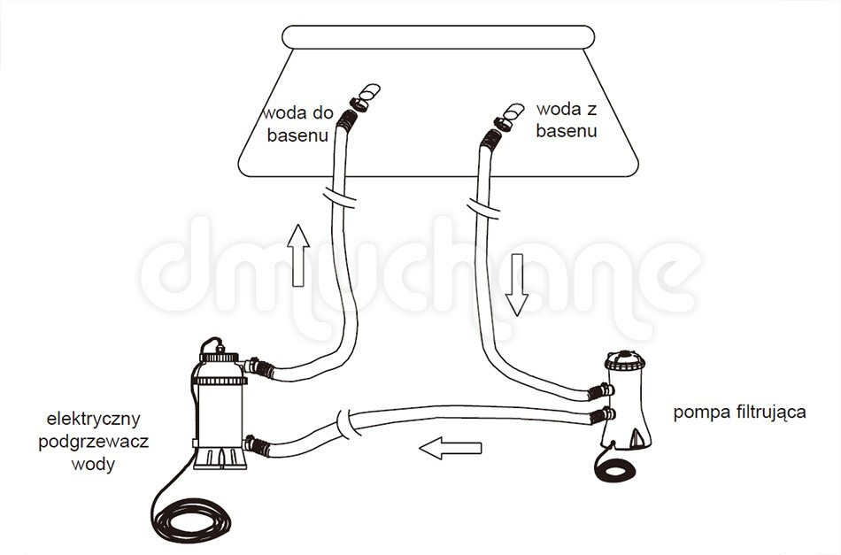 Zestaw zawiera: podgrzewacz, wąż, dwie klamry oraz dwie uszczelki oraz termometr basenowy.