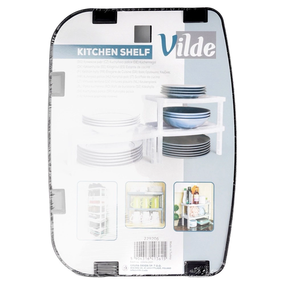 Praktyczna półka idealna do uporządkowania przestrzeni w kuchni. Półka posiada wymienne nóżki w dwóch rozmiarach, które pozwolą dopasować jej wysokość. Półka dzieli blat lub szafkę na dwie części, dzięki czemu zyskamy dodatkową przestrzeń do przechowywania akcesoriów kuchennych. Półka jest niezwykle uniwersalna. Idealne rozwiązanie dla tych, którzy chcą efektywnie wykorzystać dostępną przestrzeń w szafkach lub na blacie. Oryginalny produkt marki Vilde. Wyprodukowano zgodnie z europejskimi standardami.
