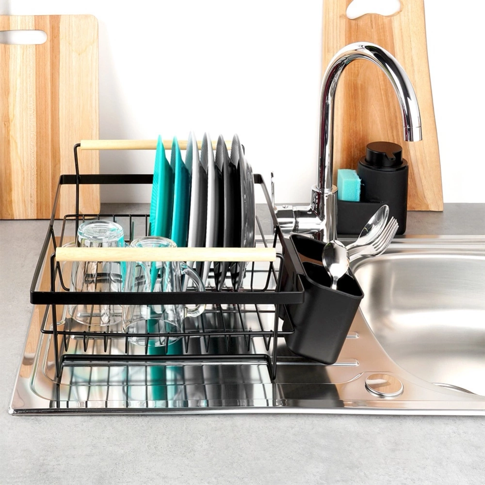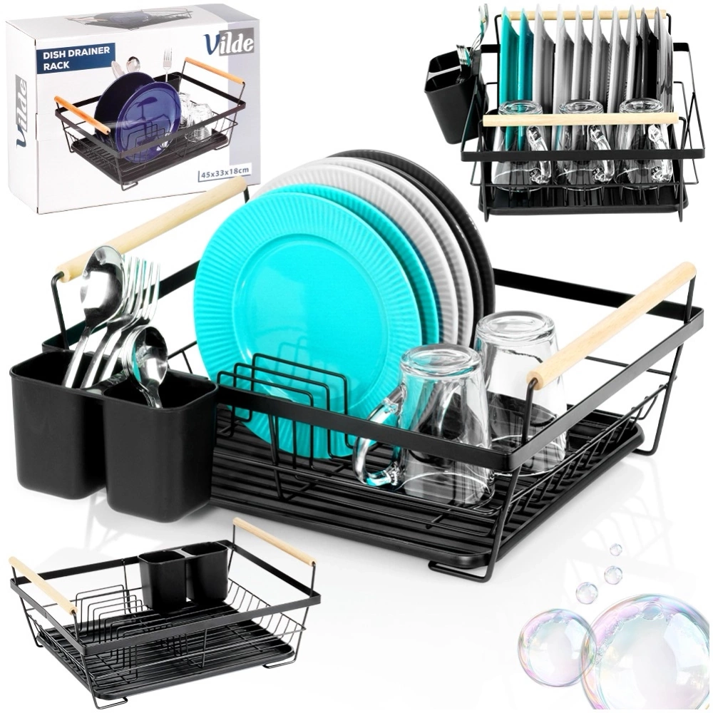 - Elegancka suszarka do naczyń w kolorze czarnym kolorze z drewnianymi uchwytami. Posiada miejsce na talerze, szklanki oraz ociekacz sztućce. Wyposażona w wyjmowaną tacę ociekową.