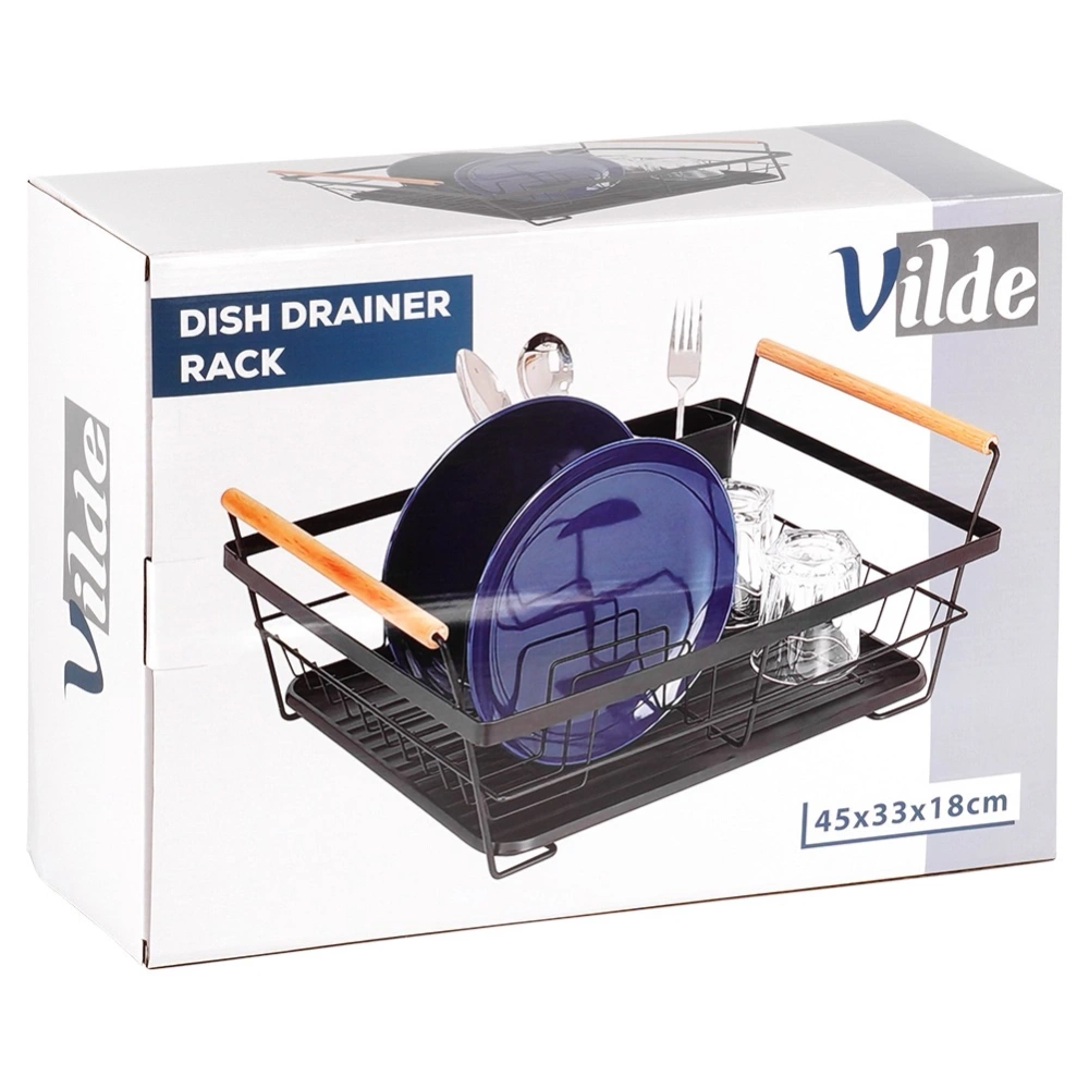 Suszarka na naczynia z miejscem na talerze oraz sztućce. Wykonana z wytrzymałych materiałów. Dzięki niej zapomnisz o nieuporządkowanych naczyniach i mokrych śladach na blacie szafek przy zlewie. Suszarka to niezbędny element wyposażenia kuchni. Wykonana w eleganckim stylu, a zarazem funkcjonalna. Łatwa w czyszczeniu. Posiada wyjmowaną tacę ociekową, dzięki czemu utrzymanie jej w czystości nie stanowi problemu. Oryginalny produkt marki Vilde. Wyprodukowano zgodnie z europejskimi standardami.