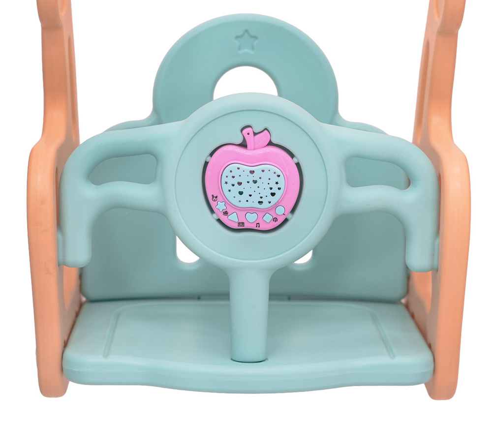 - wyjmowane jabłuszko z elementami dźwiękowymi: odgłosy zwierzątek i ich nazwy, melodie, piosenki, komendy głosowe w języku angielskim, oraz możliwość zmiany podświetlenia jabłuszka: niebieski, czerwony, zielony, mrugające światełka,