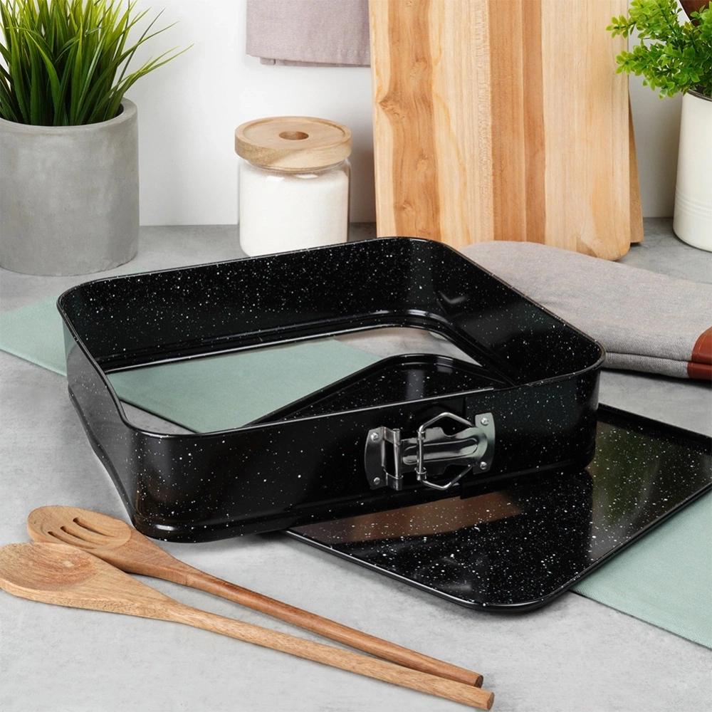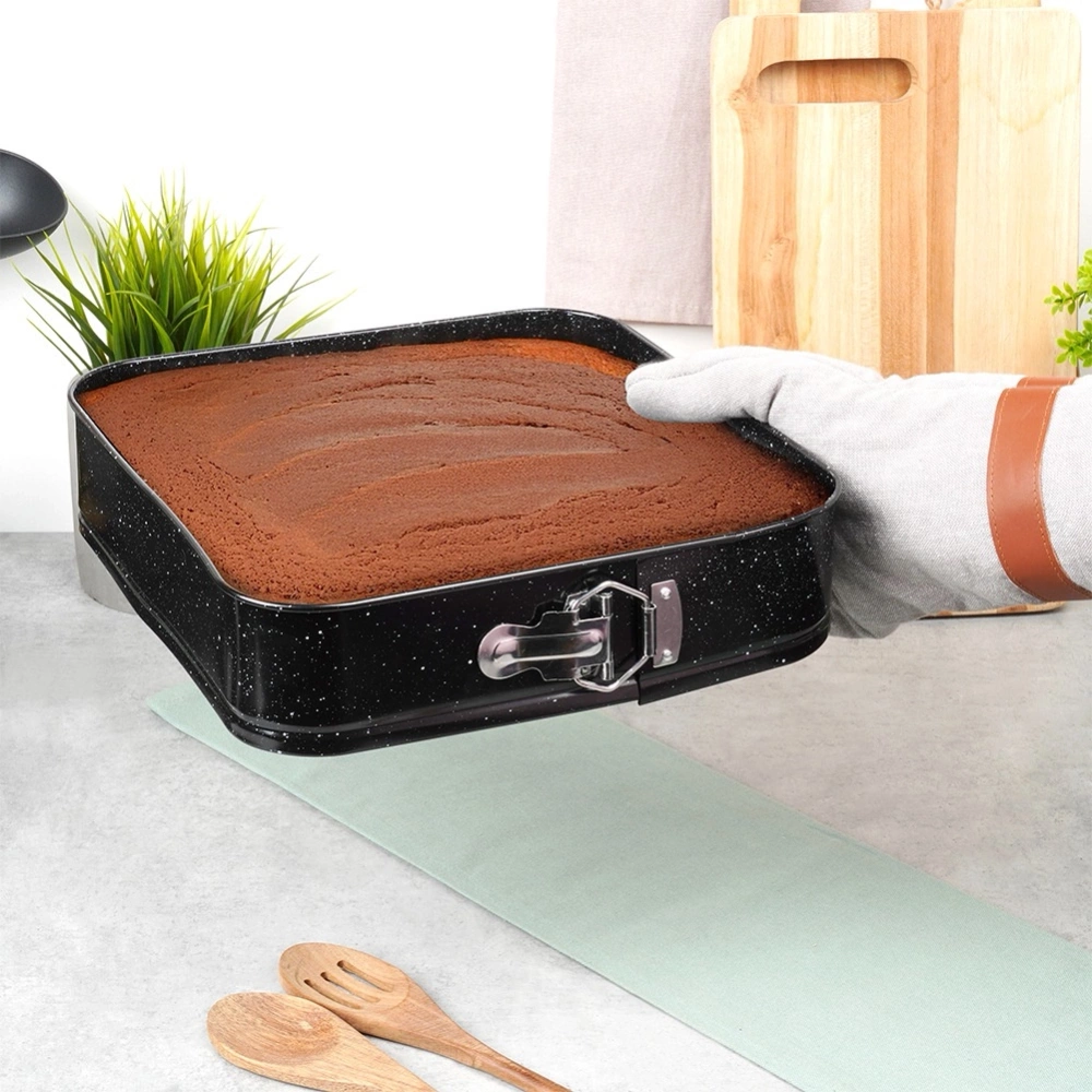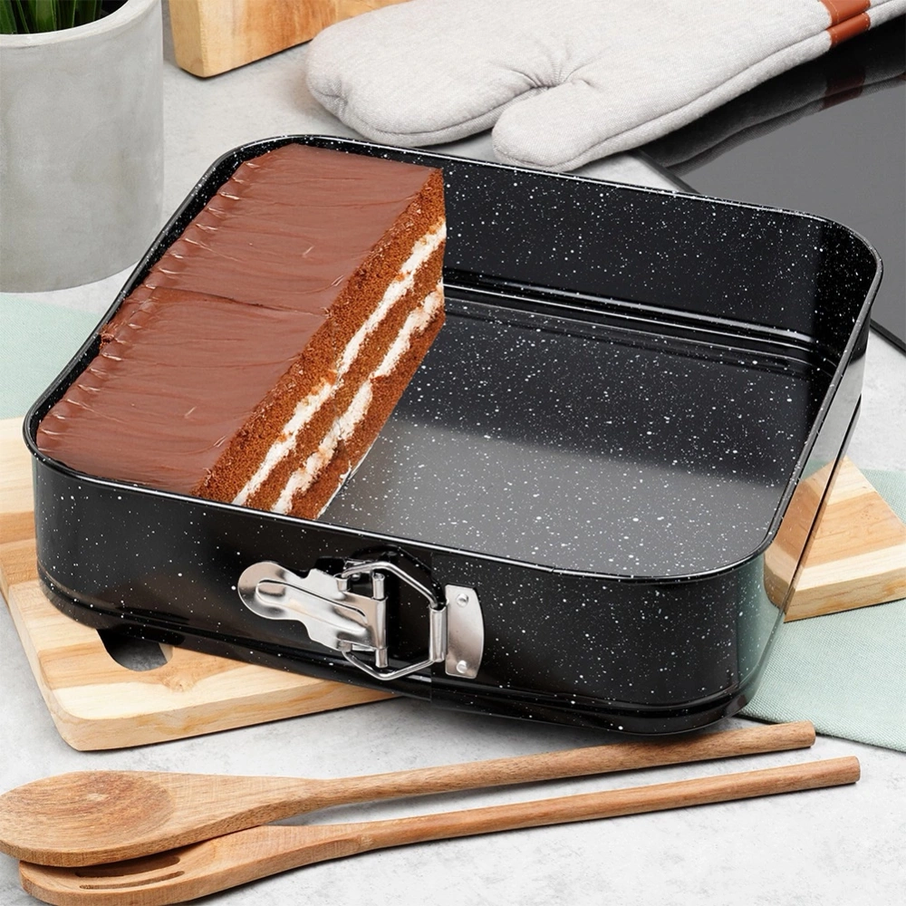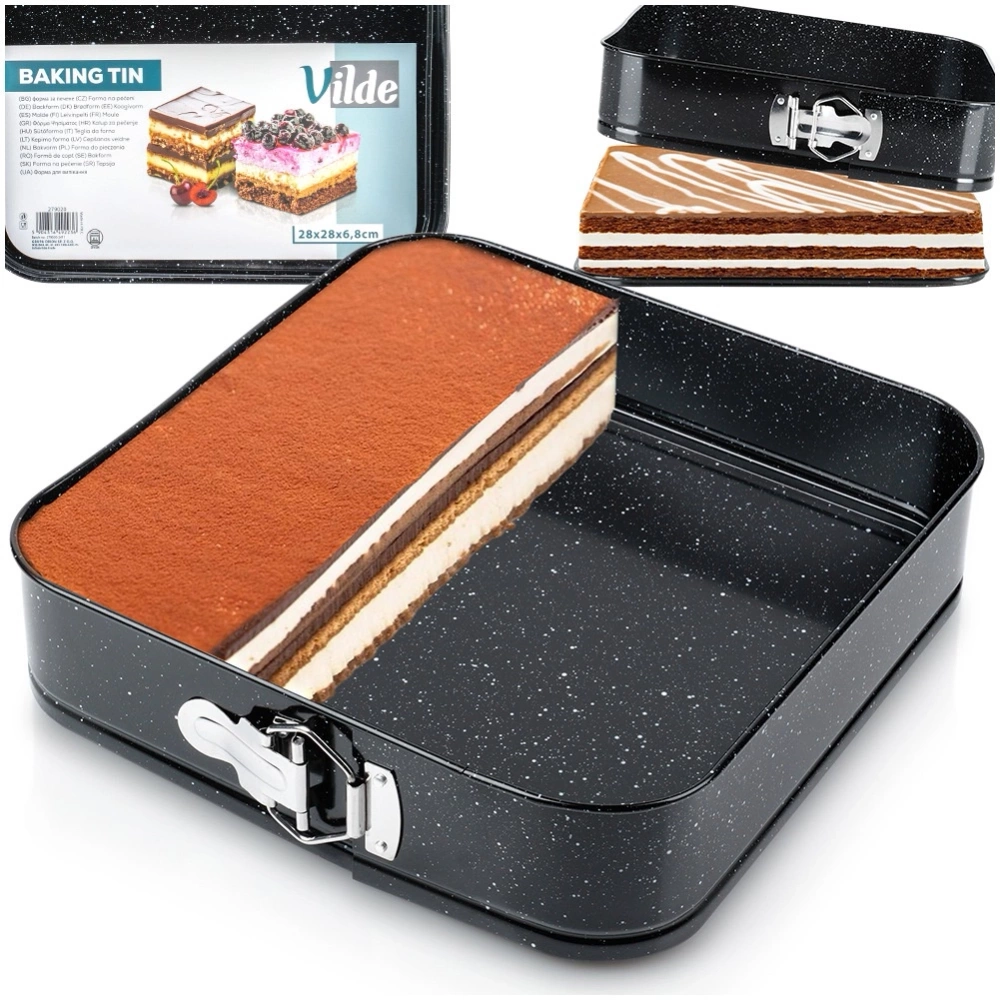 - Kwadratowa forma do pieczenia ciast z granitową powłoką. Brzegi tortownicy są rozpinane. Forma nadaje się do piekarników gazowych oraz elektrycznych.