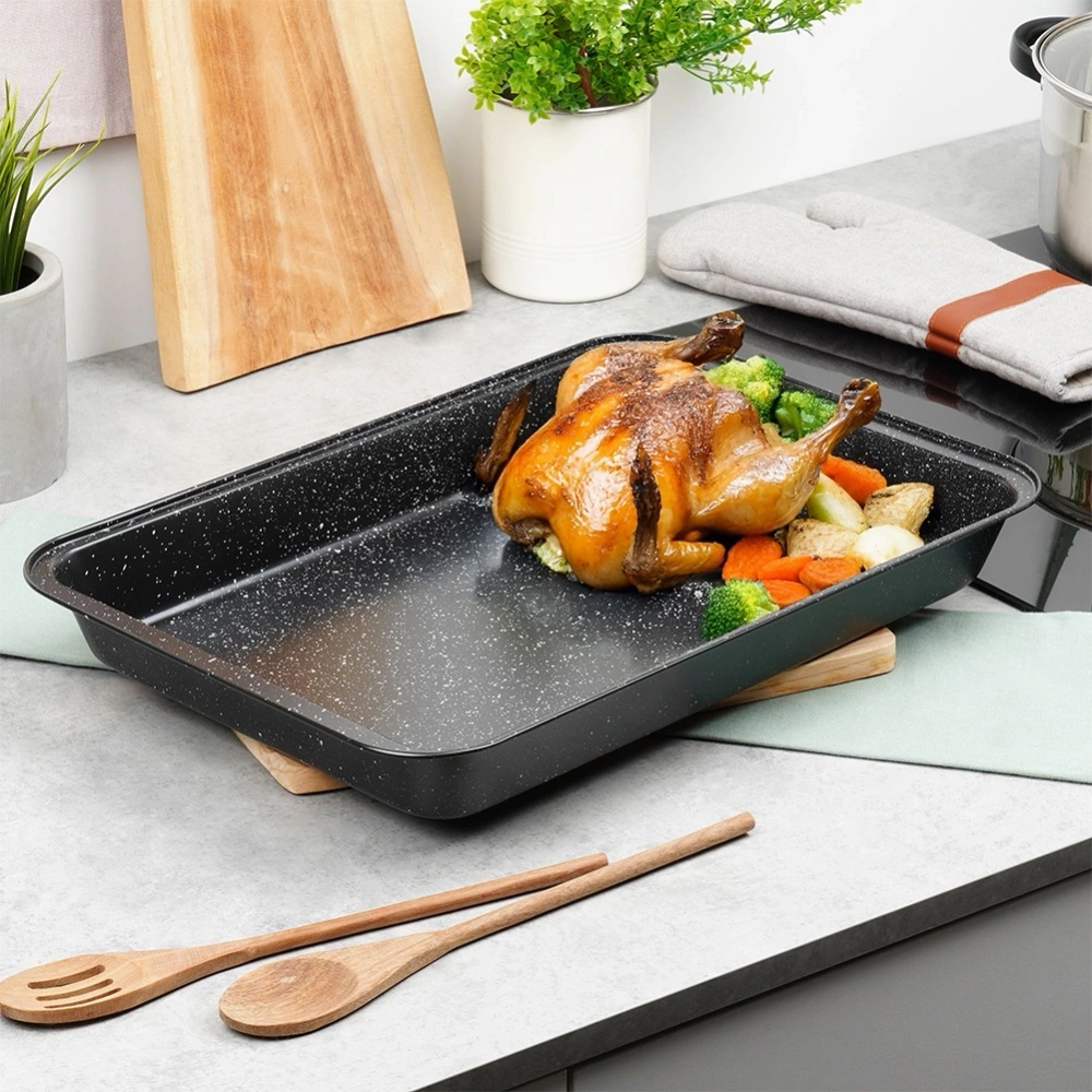 - Brytfanna z powłoką granitową do pieczenia ciastek, frytek, pizzy czy mięsa. Blacha nadaje się do piekarników gazowych oraz elektrycznych.