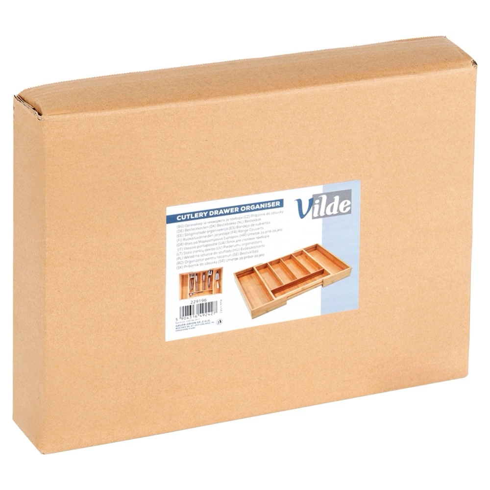 Organizer na sztućce, noże i przybory kuchenne z możliwością rozsuwania. Przydatny w każdej kuchni. Umożliwia przechowywanie różnych akcesoriów kuchennych w sposób uporządkowany i zorganizowany. Taca do szuflady pozwoli odpowiednio zagospodarować przestrzeń oraz utrzymać porządek wewnątrz szuflady. Łatwy w czyszczeniu i wygodny w użytkowaniu. Oryginalny produkt marki Vilde. Wyprodukowano zgodnie z europejskimi standardami.