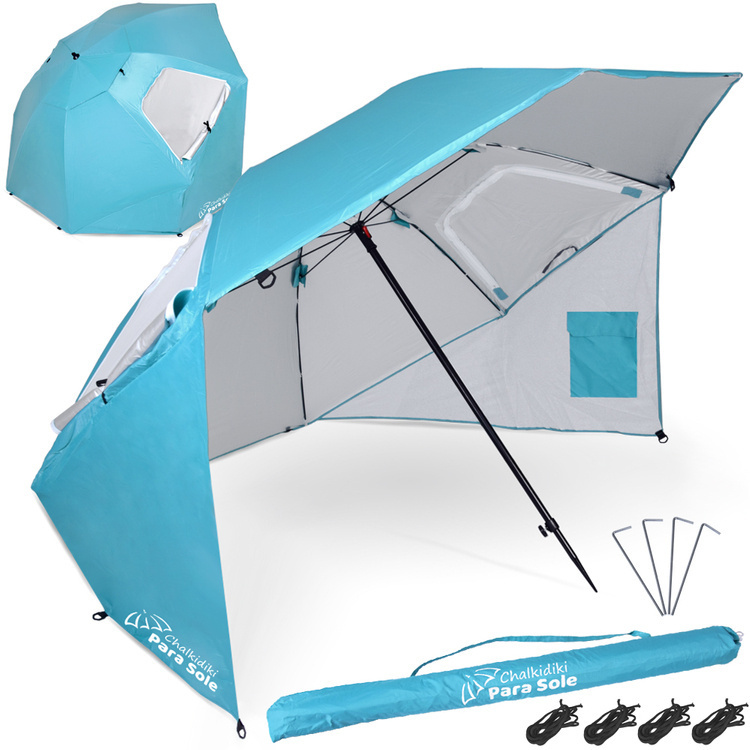 Parasol Chalkidiki Para Sole UPF 50+ dba o Twój komfort. Parasol posiada dwa okna z moskitierą oraz wywietrzniki, które zapewniają doskonałą cyrkulację powietrza. Dodatkowo, wewnętrzne kieszenie umożliwiają przechowywanie napojów, jedzenia i innych drobiazgów.