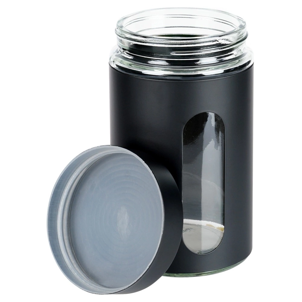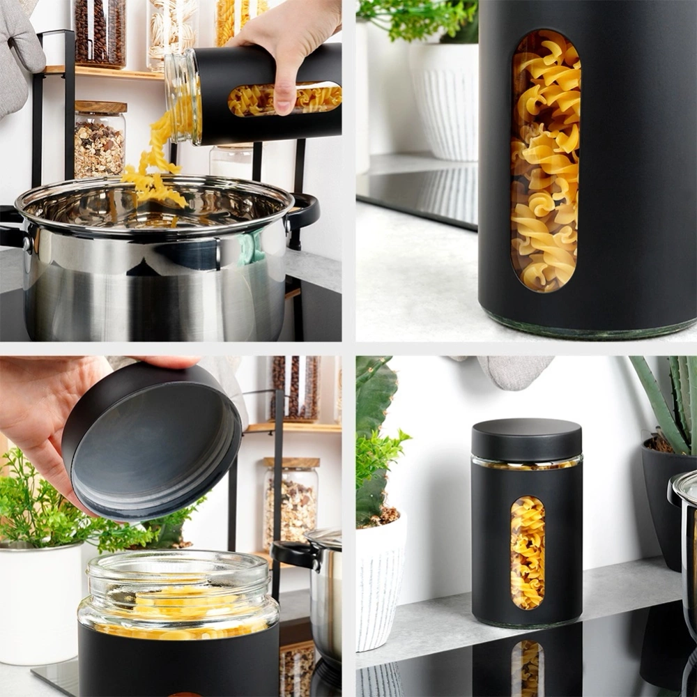 - Szklany pojemnik idealny do przechowywania różnych produktów spożywczych. Szczelny dzięki zakręcanej pokrywce. Posiada czarne, matowe wykończenie.